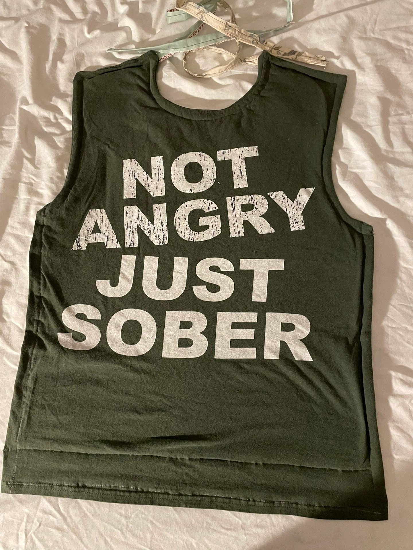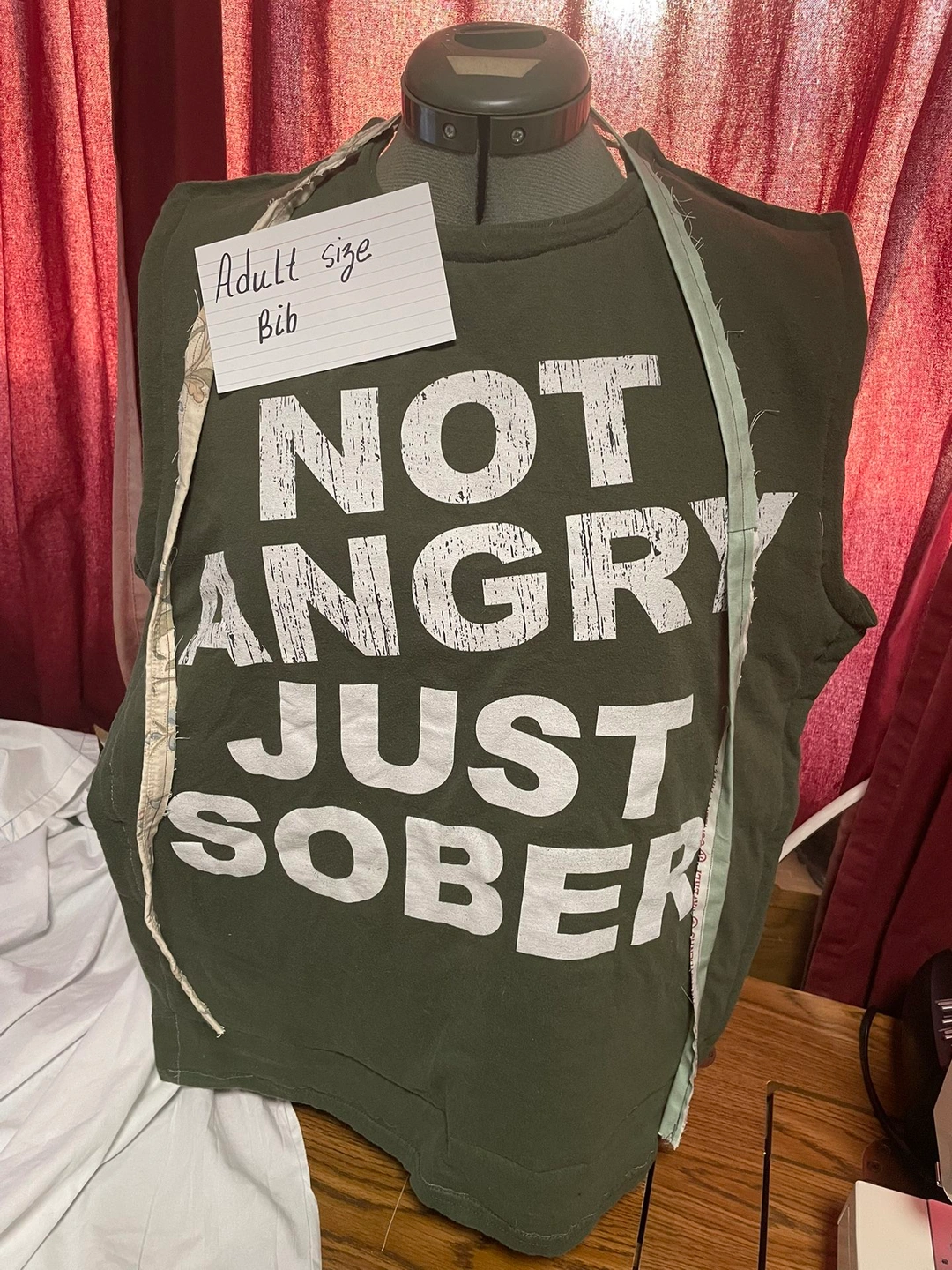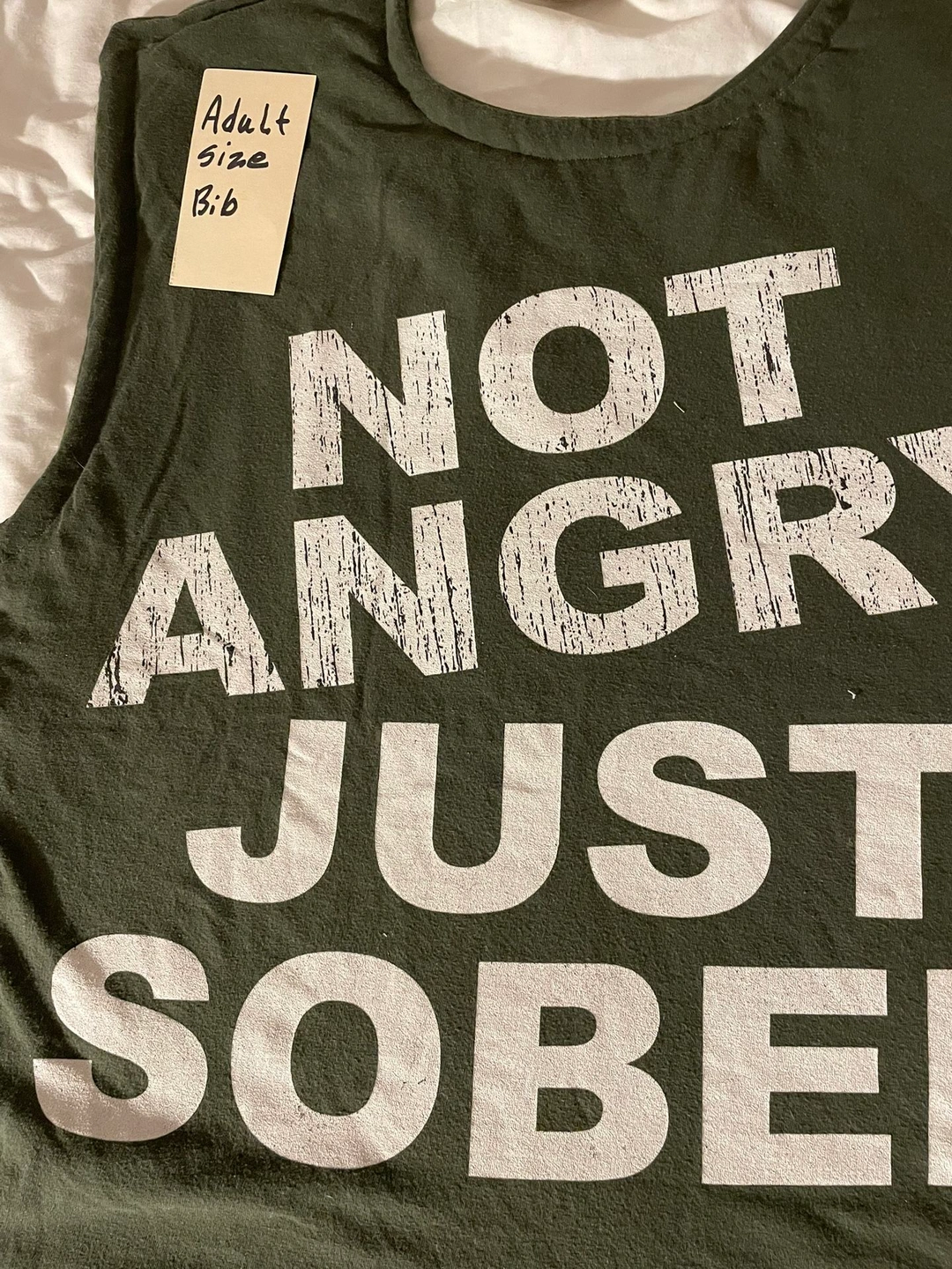 Not angry just sober adult size bib. Tie closure, triple layered. Clothing protection with dignity and humor. Approximately 17 inches by 27 inches. Pick up in Niles Illinois.