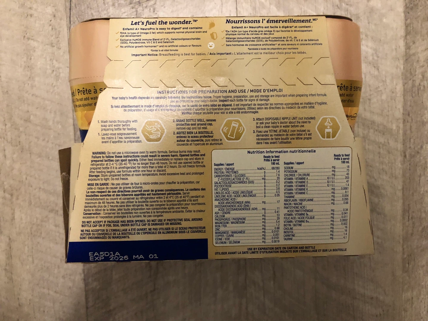 This is Enfamil Neuro Pro infant formula, designed for babies 0+ months. It comes in a 6-pack of 237 ml bottles. The formula includes DHA PLUS and HUMO6 immune blend.