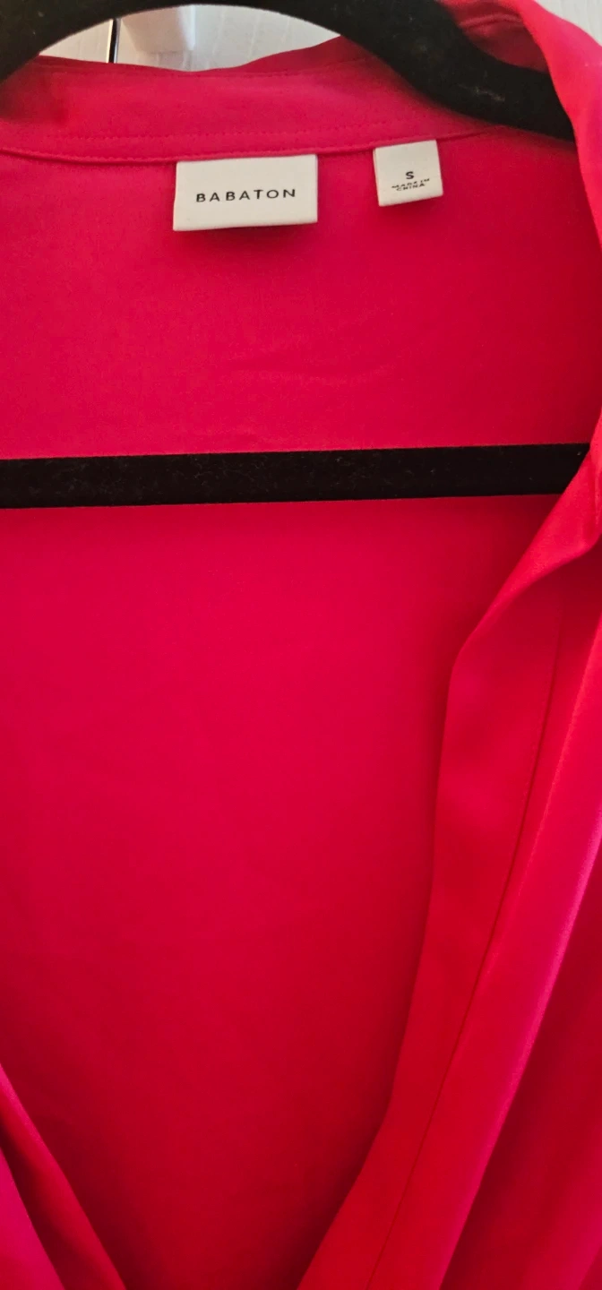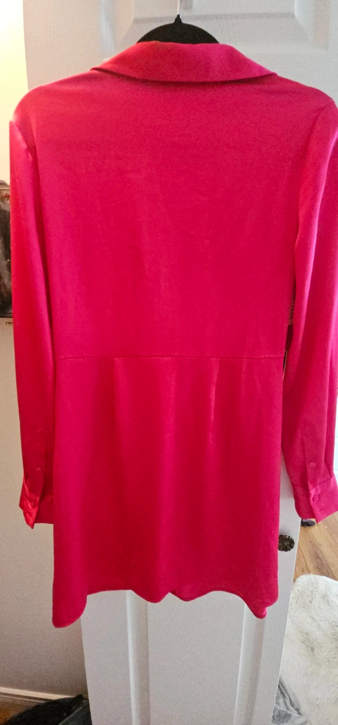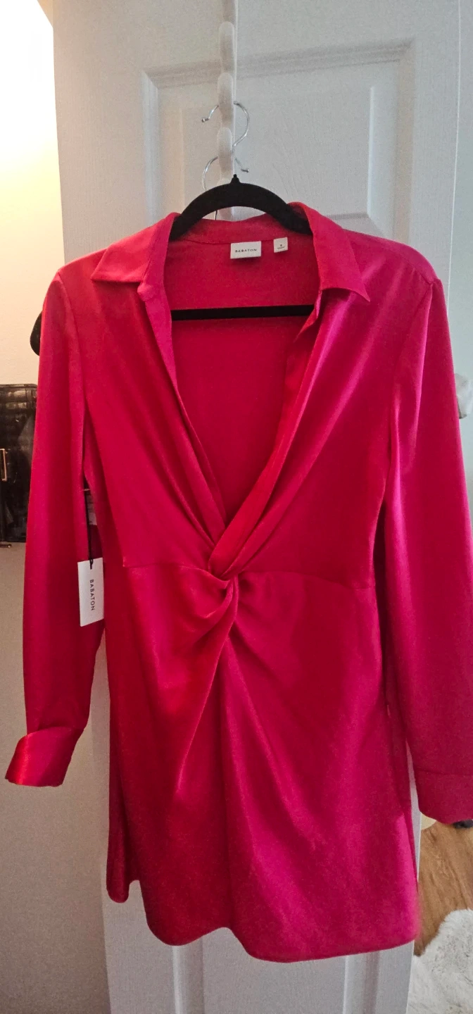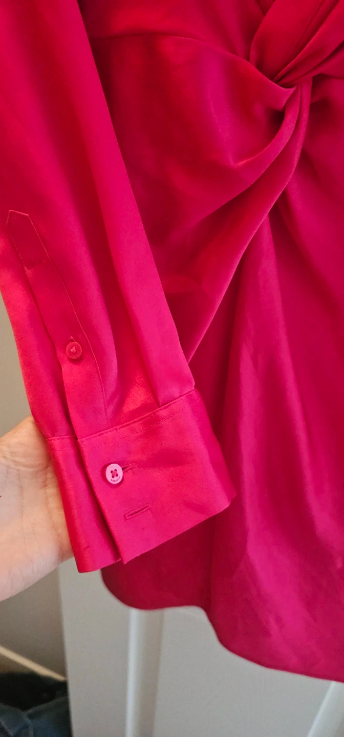 This is a bright pink, long-sleeved satin dress from Babaton. It features a twist-front detail