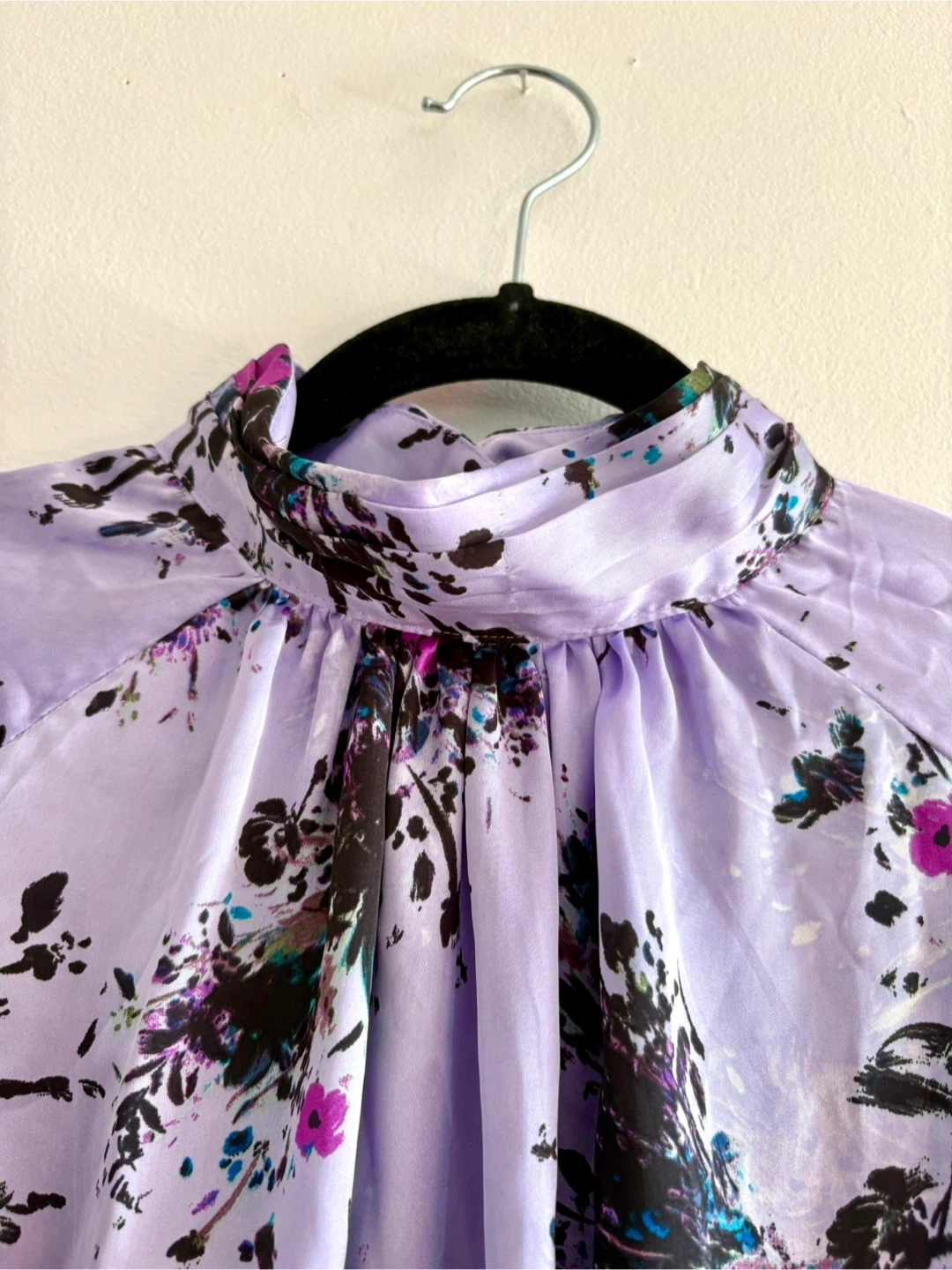 It features a unique floral print on a light purple background.
