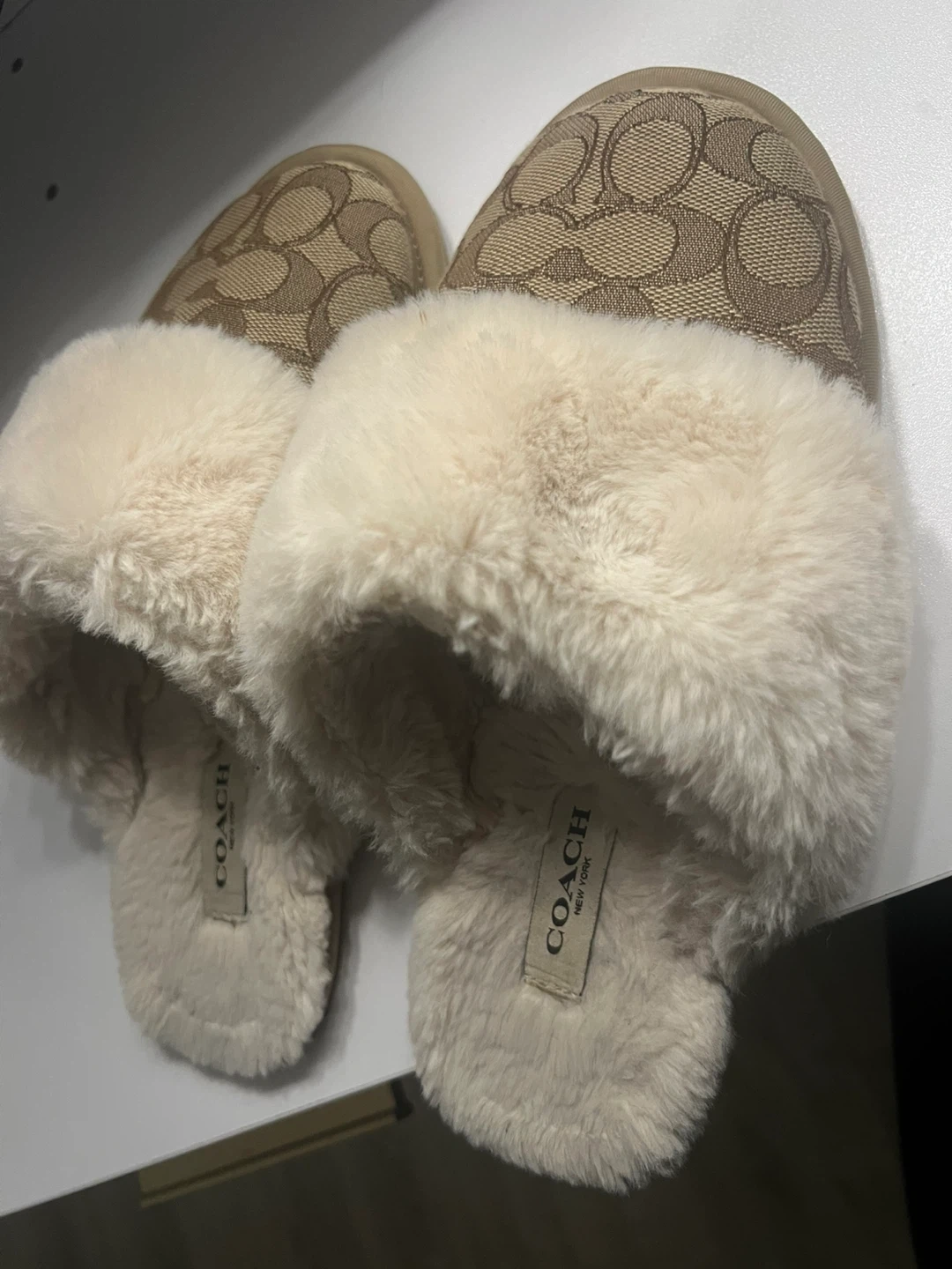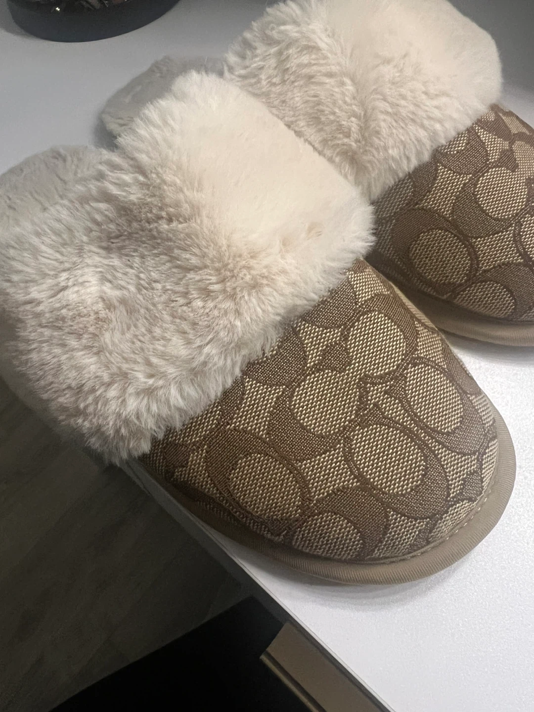 Cozy Coach slippers featuring the signature C monogram print. These have a soft faux fur lining and trim for extra warmth. Perfect for lounging around the house!