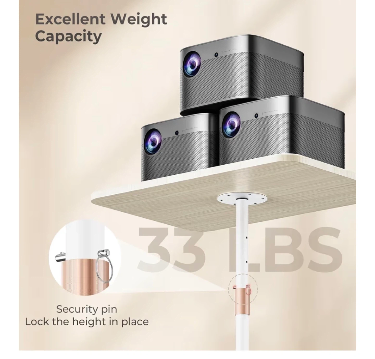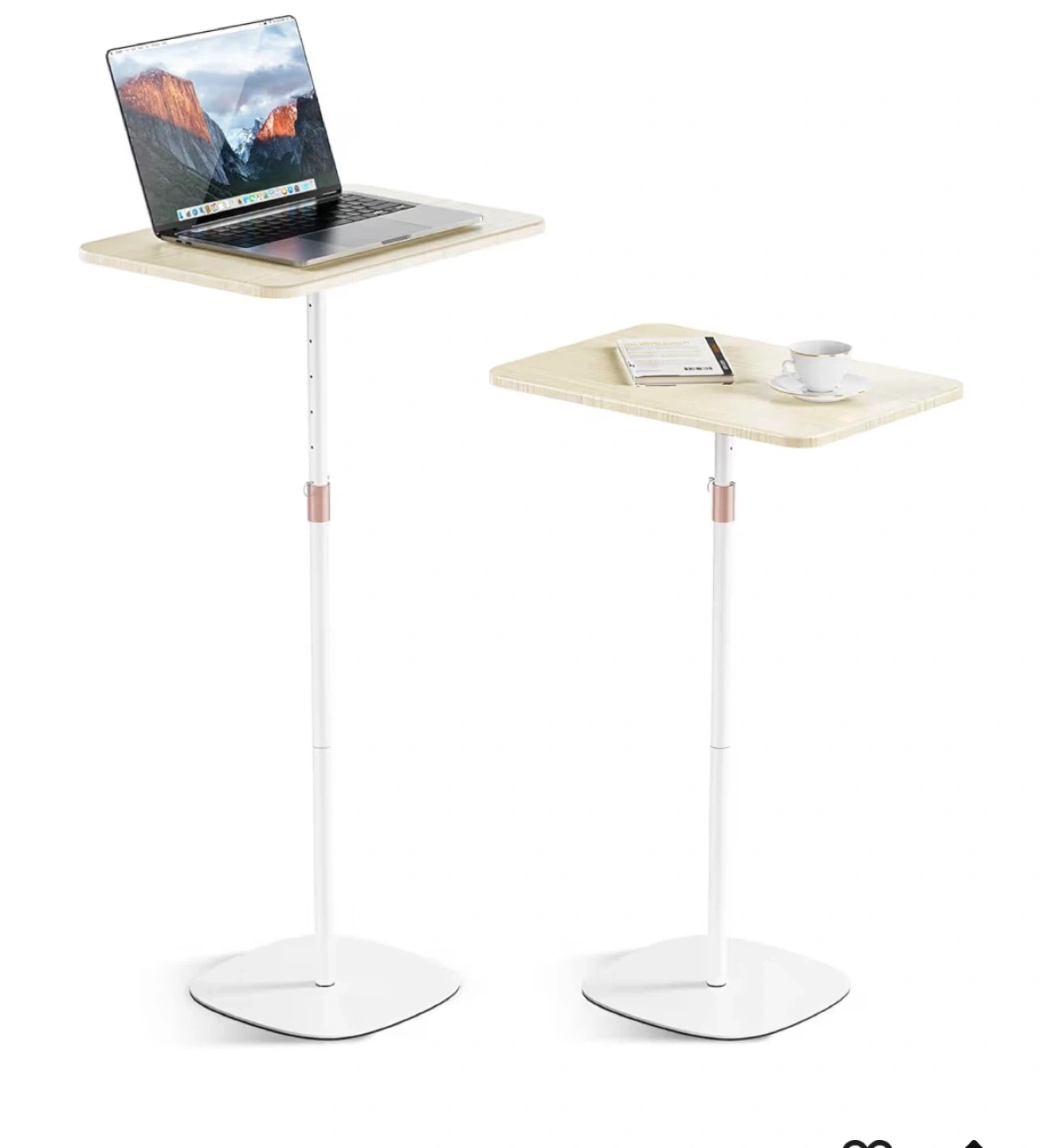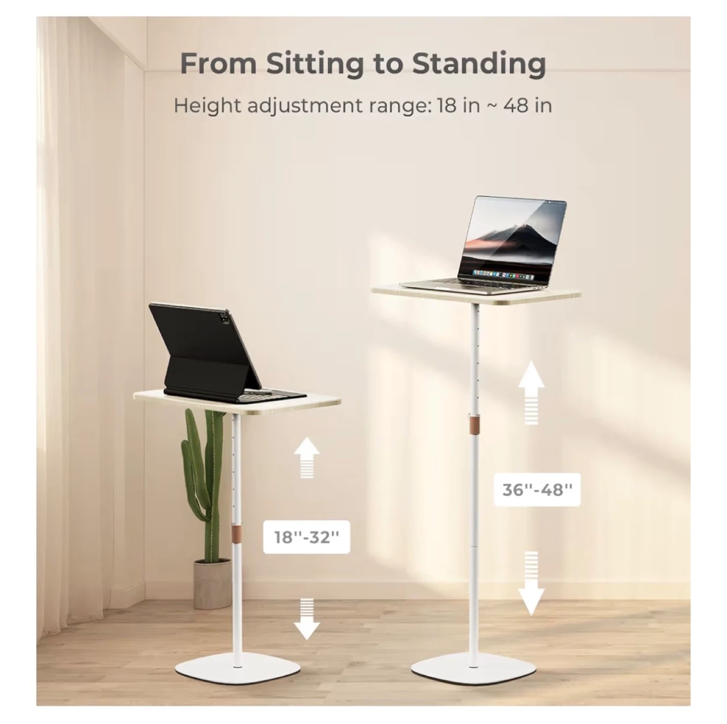 This standing desk easily adjusts from 18 to 48 inches. It has a weight capacity of 33 lbs and includes a security pin to lock the height in place. Useful for comfortable working or relaxed reading.