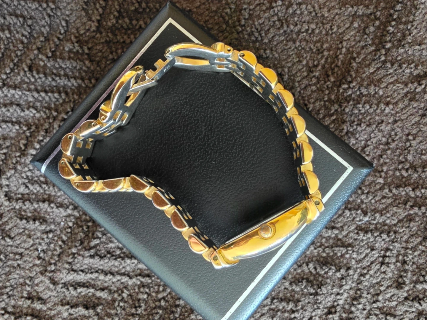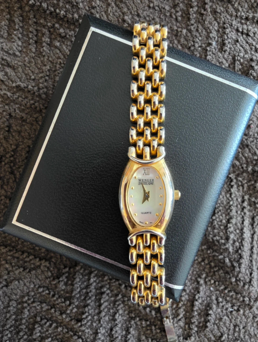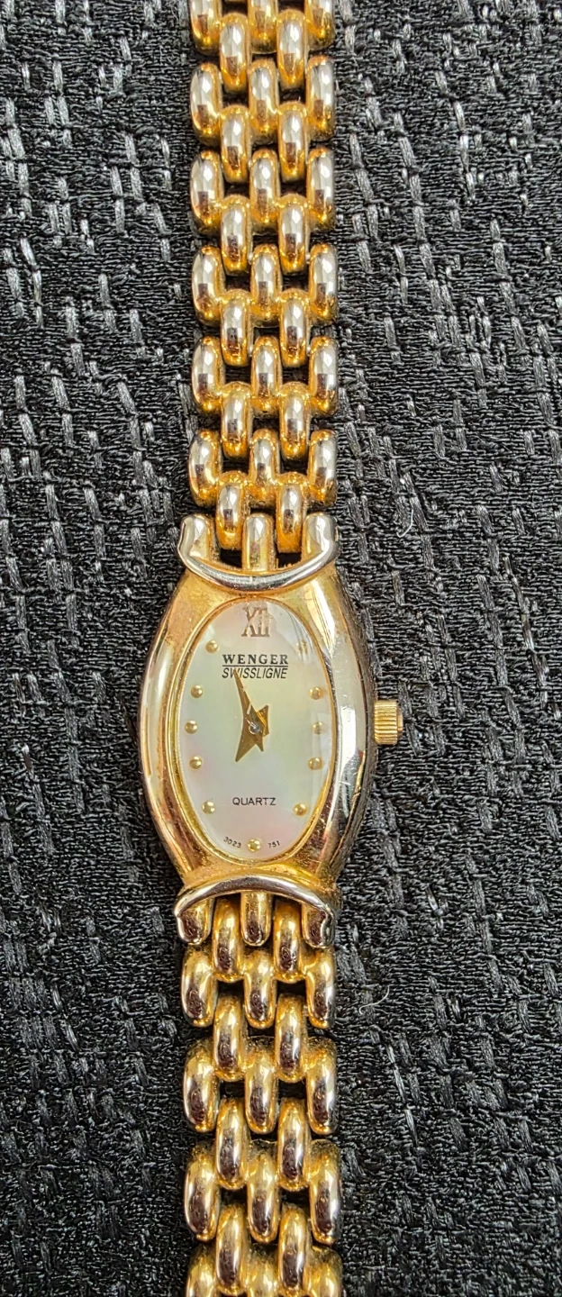 A Wenger Swiss Military ladies' quartz watch. It features a gold-tone and silver-tone link bracelet with a mother-of-pearl dial. The back is stainless steel.