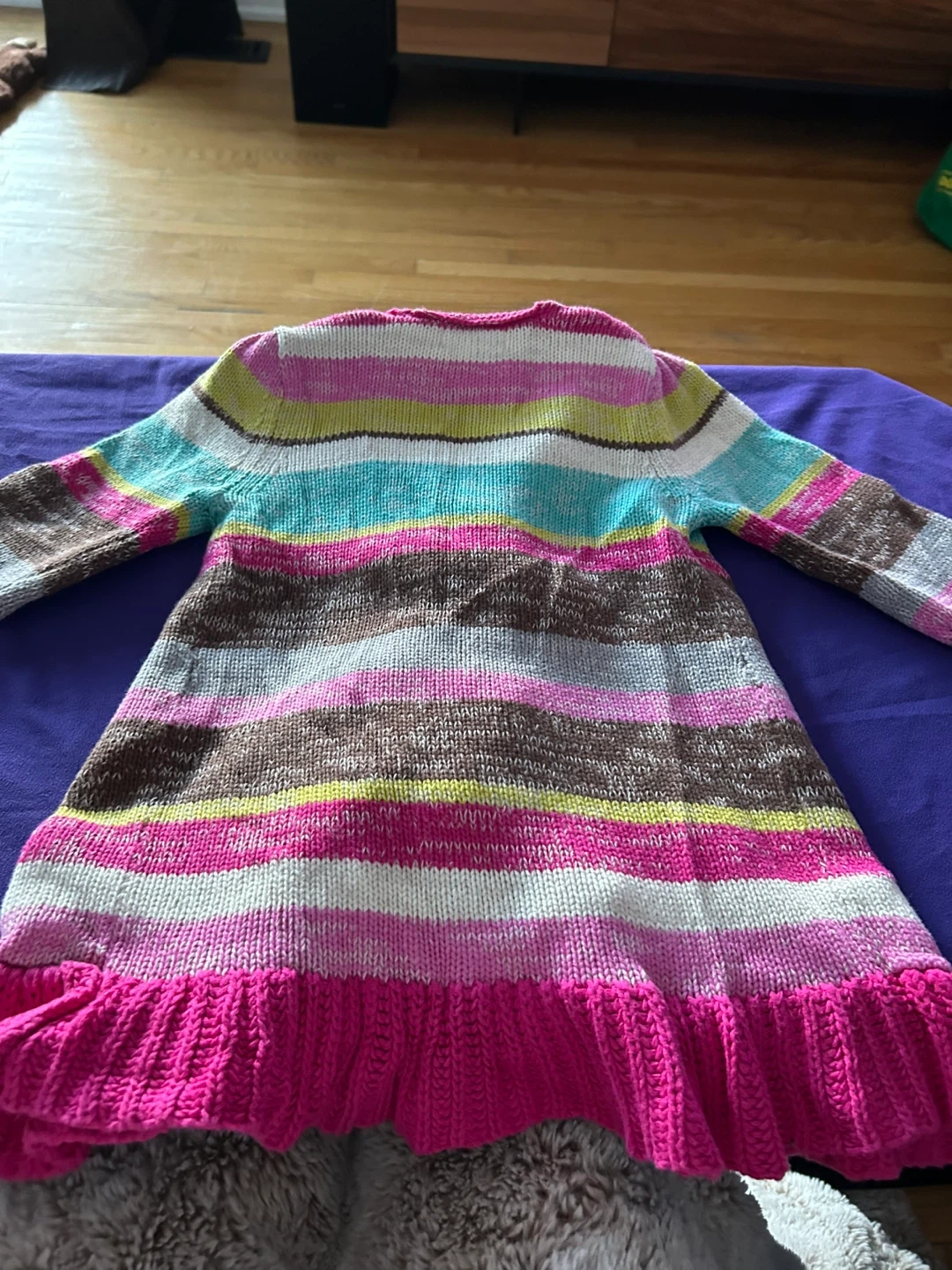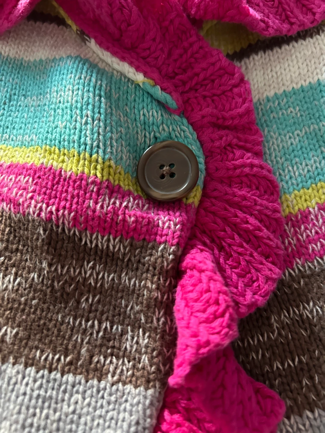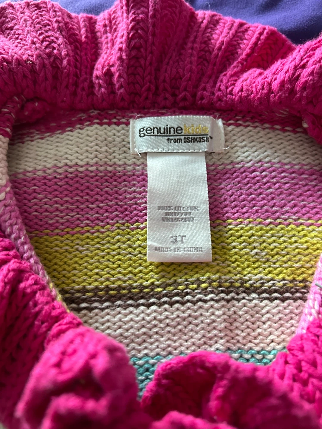 This is a Genuine Kids from OshKosh sweater for a toddler. It's a size 3T and made of 100% cotton. Features a colourful stripe pattern with ruffled trim and a button closure.