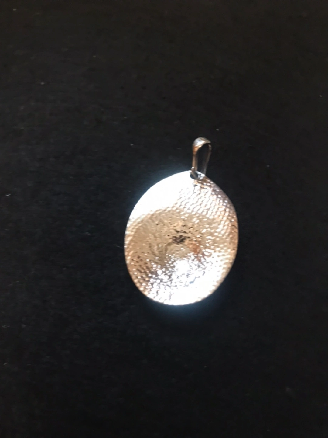 A shiny silver oval pendant with a hammered textured back. It's a simple, classic piece for any outfit. Measures 2” X 1.5”