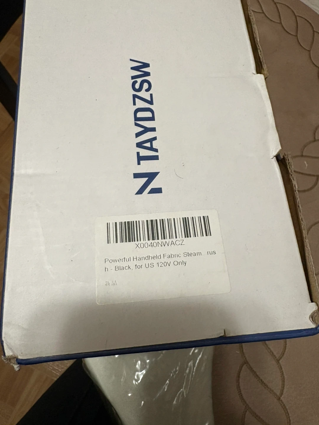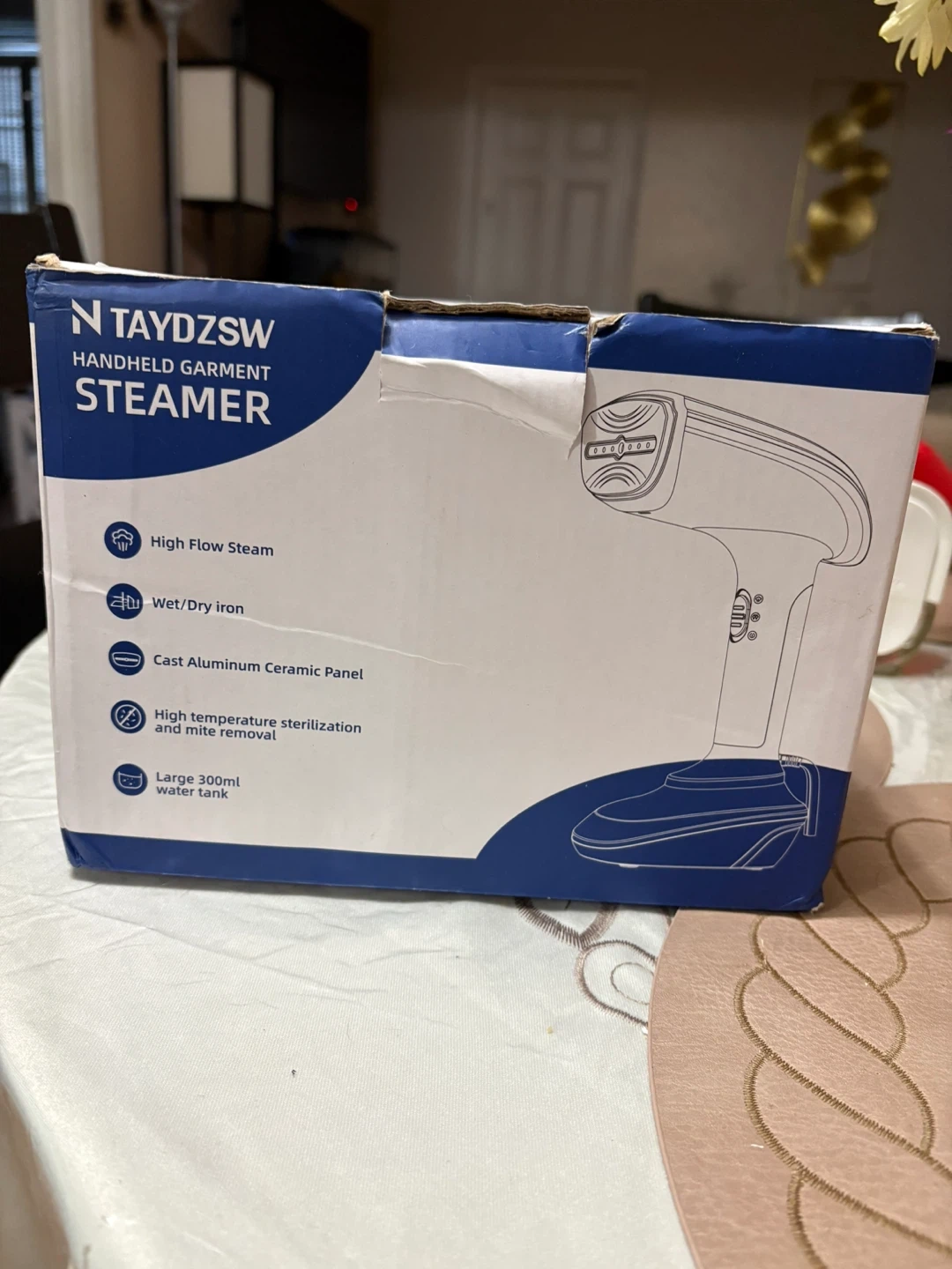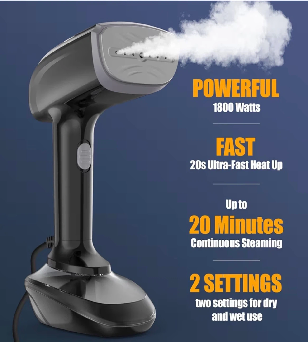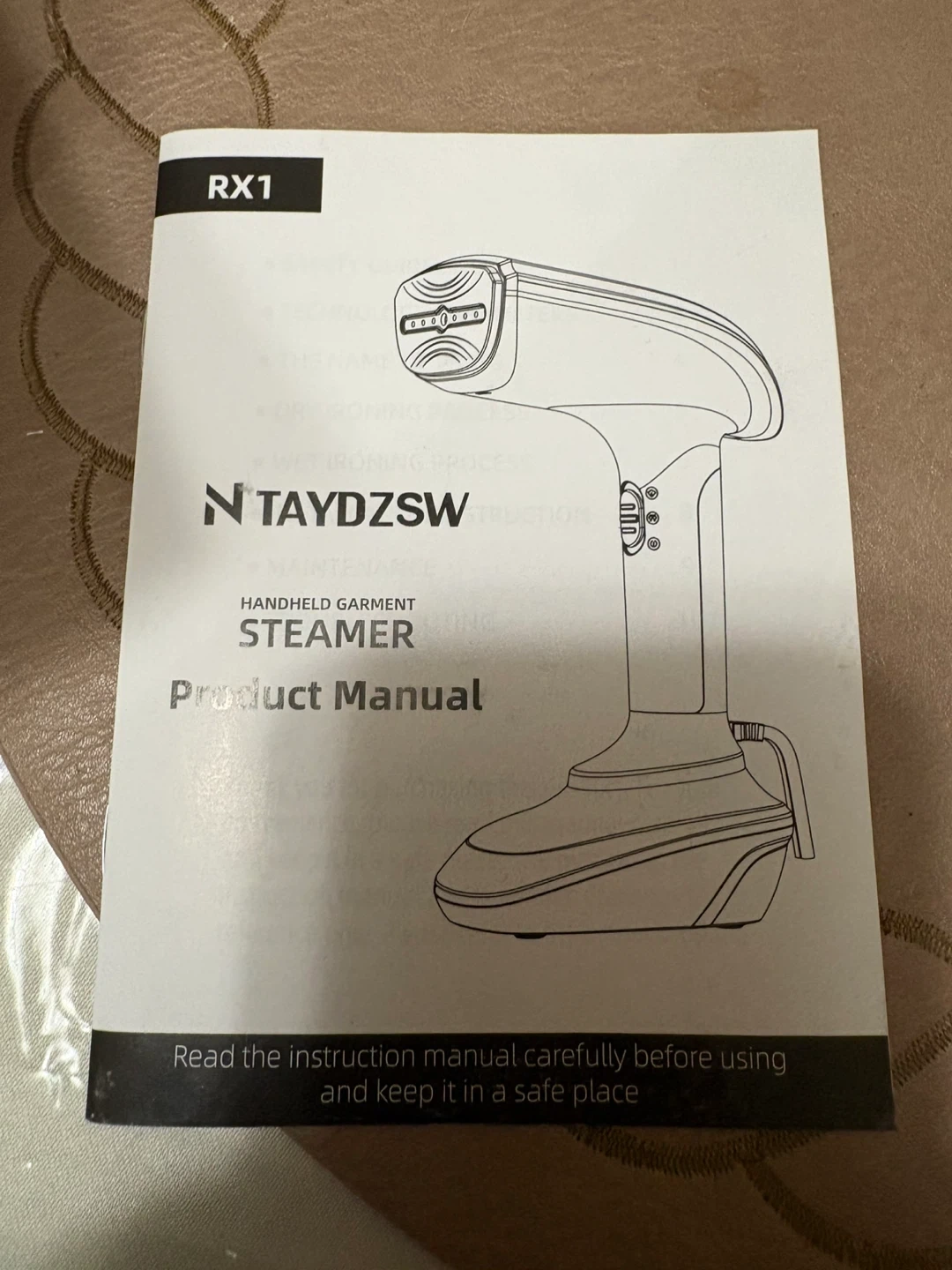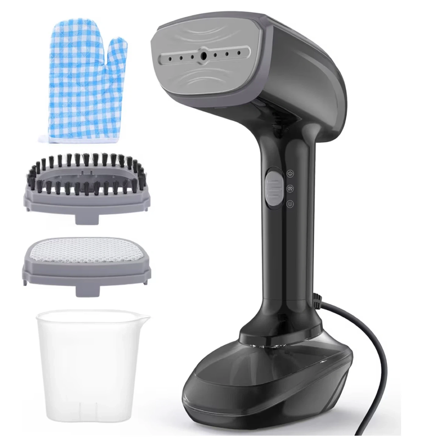 This is a TAYDZSOW RX1 handheld garment steamer. It's 1800 Watts and has a fast 20-second heat-up time. It comes with a measuring cup, a brush attachment, and a heat-resistant glove. The steamer offers up to 20 minutes of continuous steaming with two settings for dry and wet use.