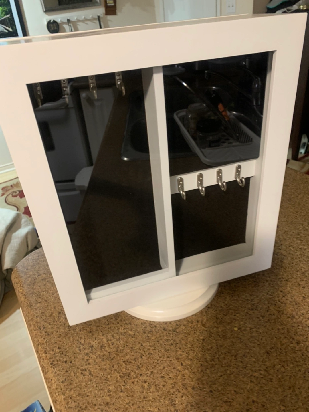 Here's a rotating jewelry organizer cabinet! It's white and has a mirror on the front. Inside, there are hooks and compartments for storing all your favourite pieces. It's a great way to keep everything organized and easy to find