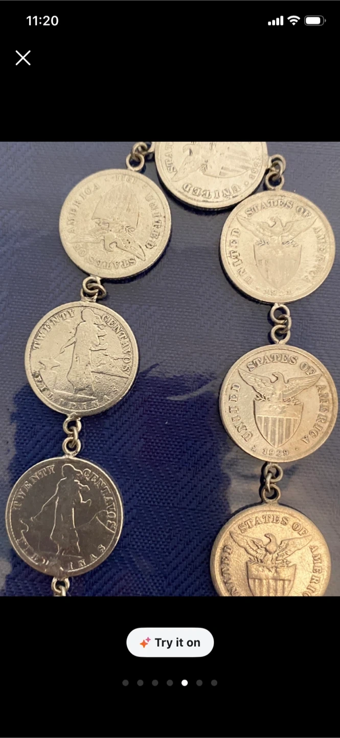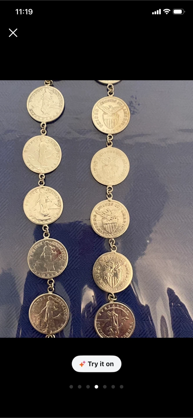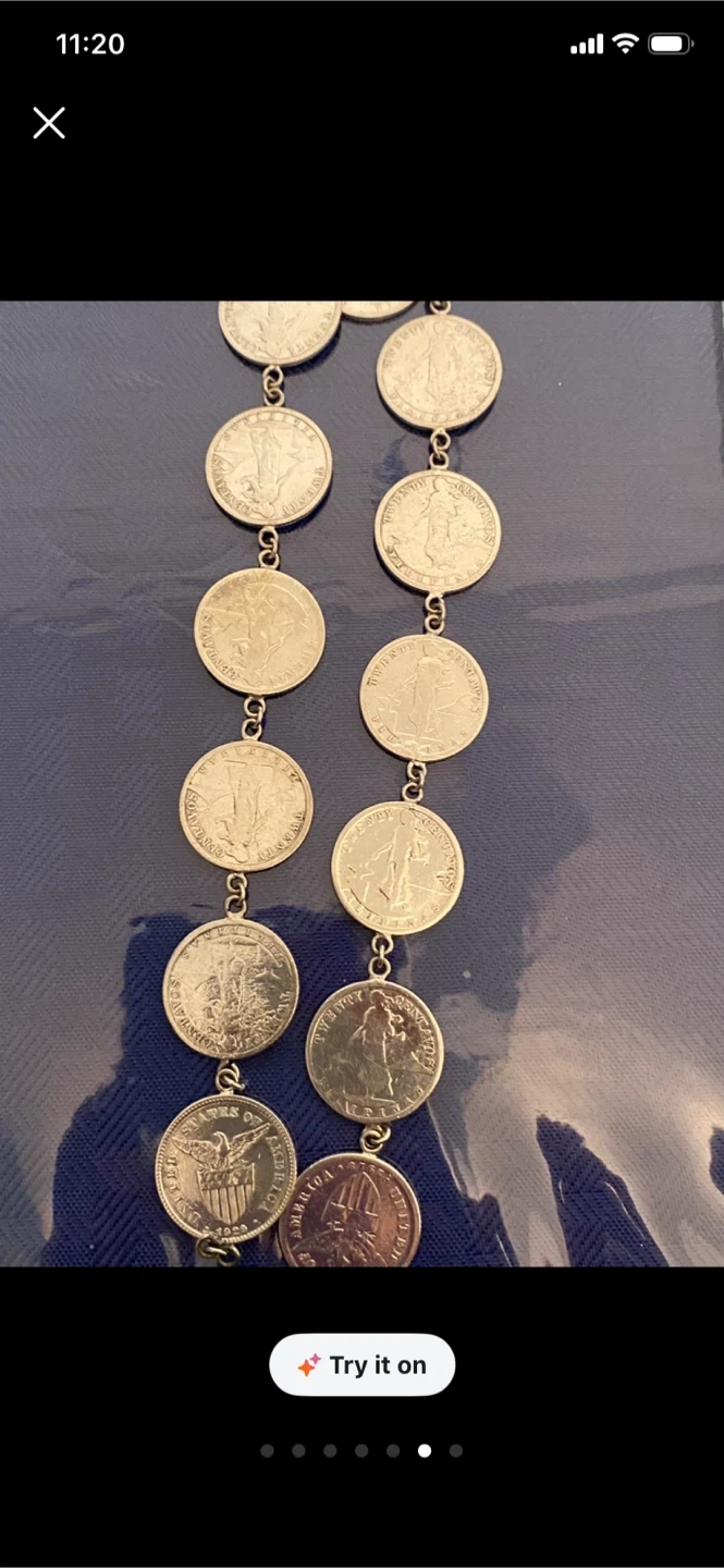 A unique necklace made from various silver coins, linked together. It's a statement piece for any collector or fashion-forward individual. The coins appear to be vintage US currency, showcasing different designs.1917-920,s