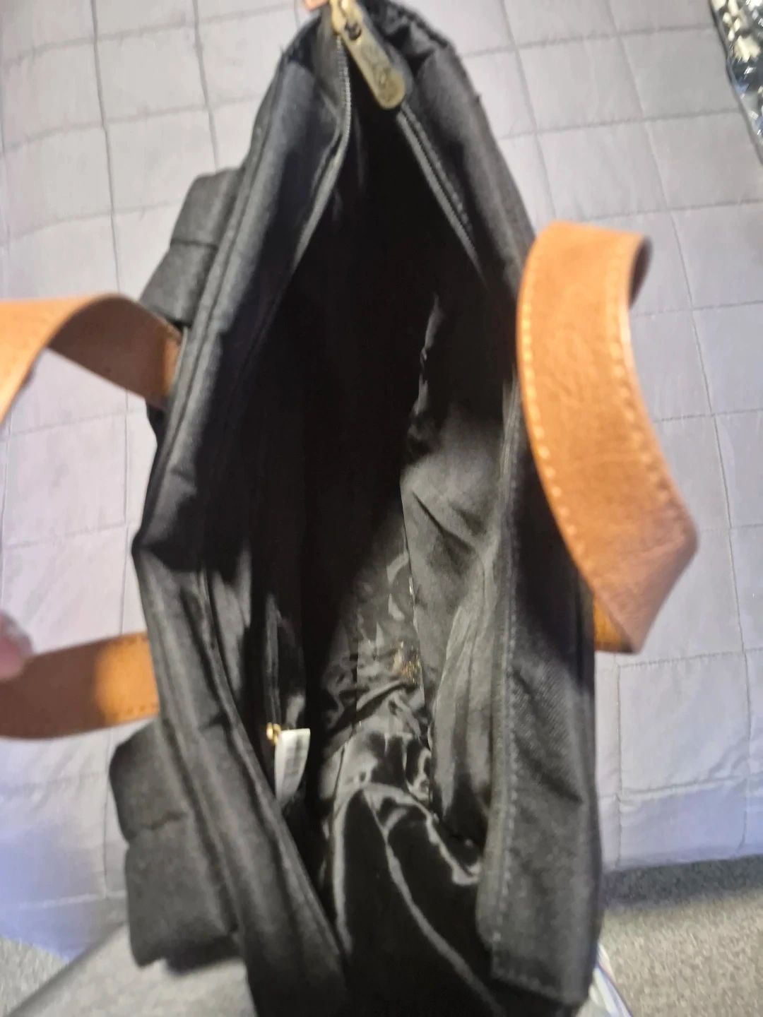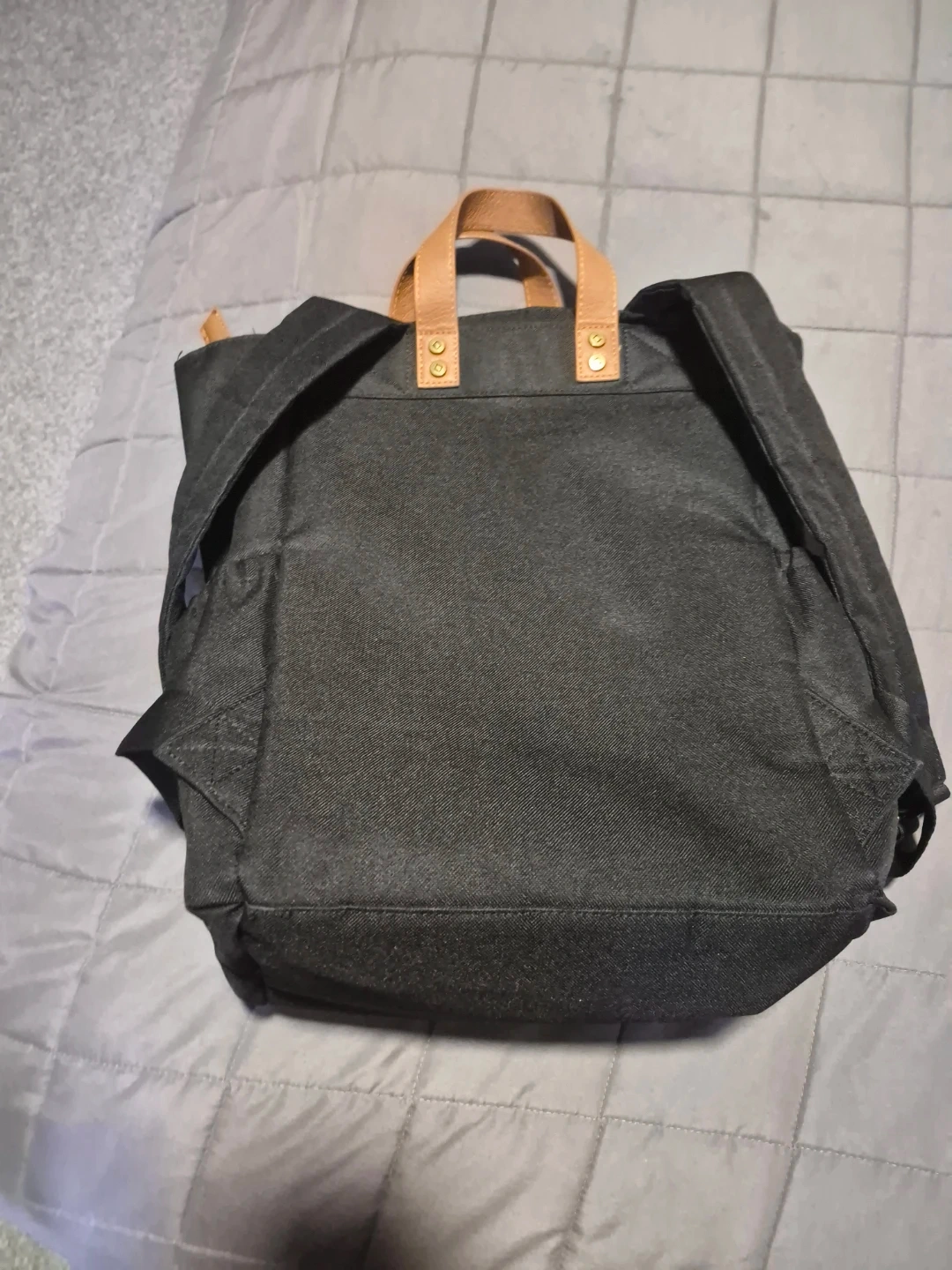 Tgirty-one Black canvas backpack with tan leather handles and strap details. It has a zippered main compartment and a front zippered pocket. The interior is lined and includes a smaller zippered pocket. This bag's versatile design makes it suitable for everyday use.