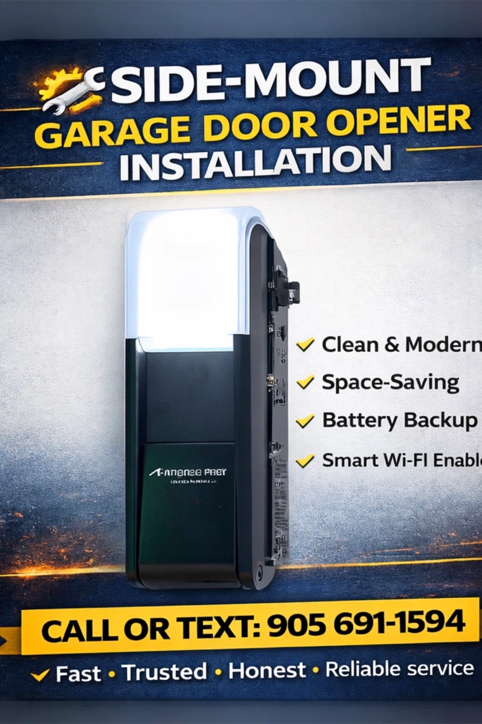 This is a side-mount garage door opener. It's clean, modern, and space-saving. Features include battery backup and smart Wi-Fi enable. Ideal for new installations or upgrades.