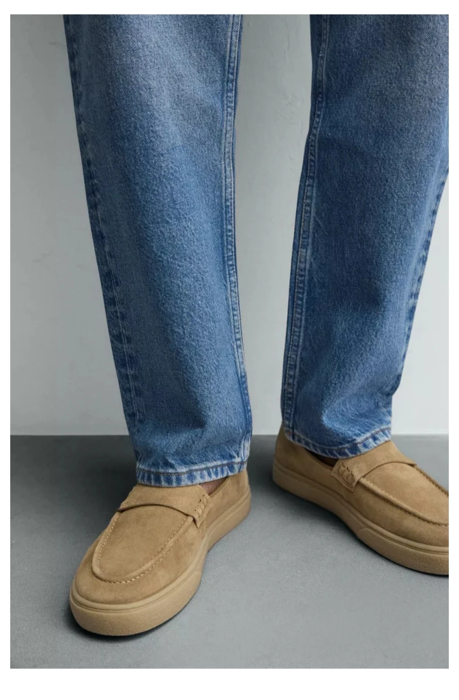 Casual loafers in sandy brown. Leather upper with a split leather finish and saddle detail on the instep. Round toe with a matching sole. These are a size 40