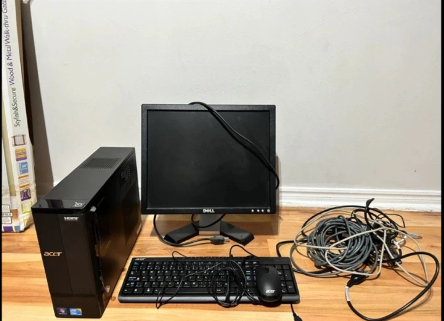 Acer Aspire desktop computer. It's running Windows 7 and has an Intel Core i3 processor with 4GB RAM and a 500GB hard drive. Comes with a DVD-Super Multi drive and built-in media card reader. Includes keyboard, mouse, and monitor.