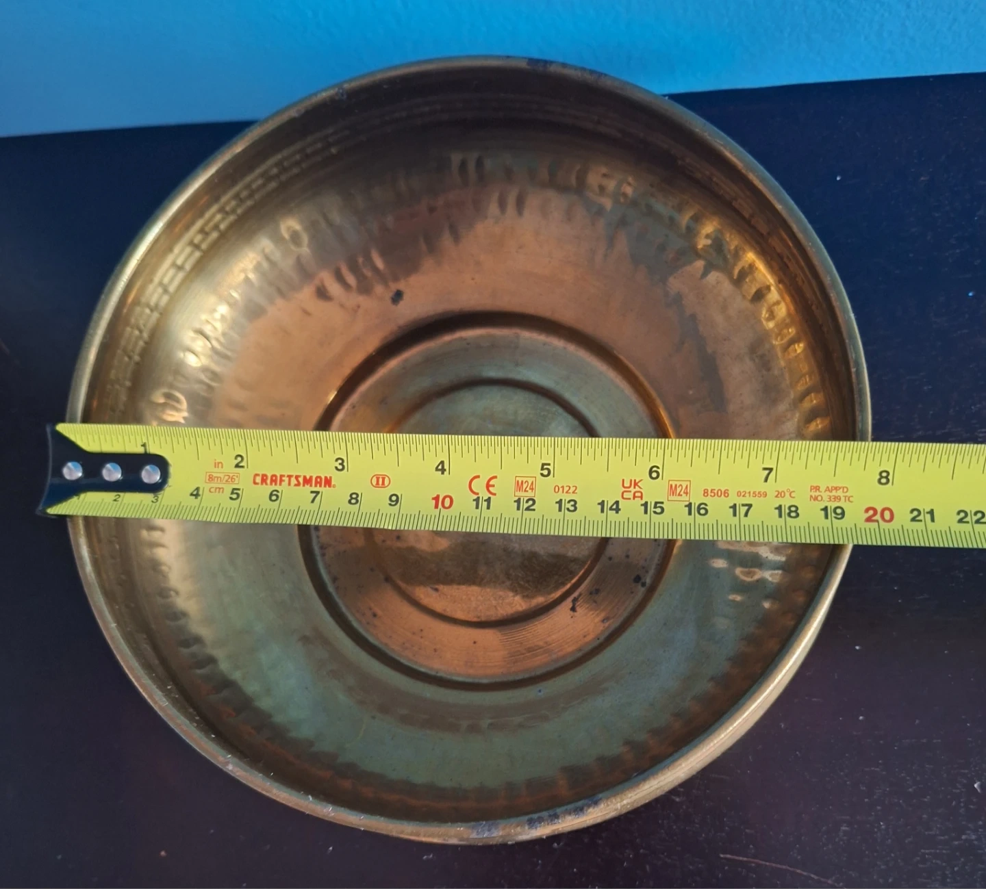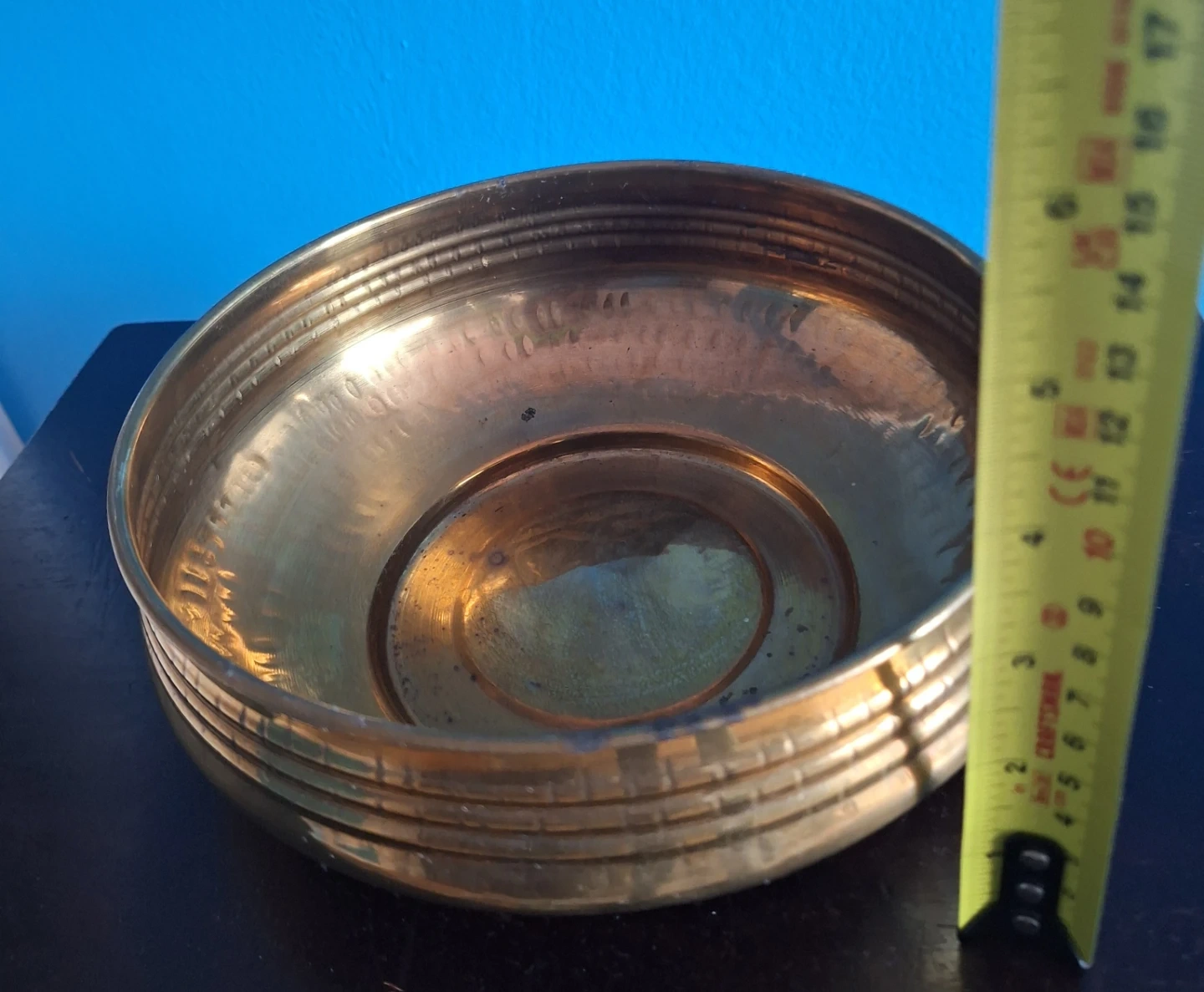 This is vintage decorative brass bowl, planter, possibly uruli. It has a hammered finish and ridged detailing on the outside. Diameter is approximately 9 inches, height 3.5 inches