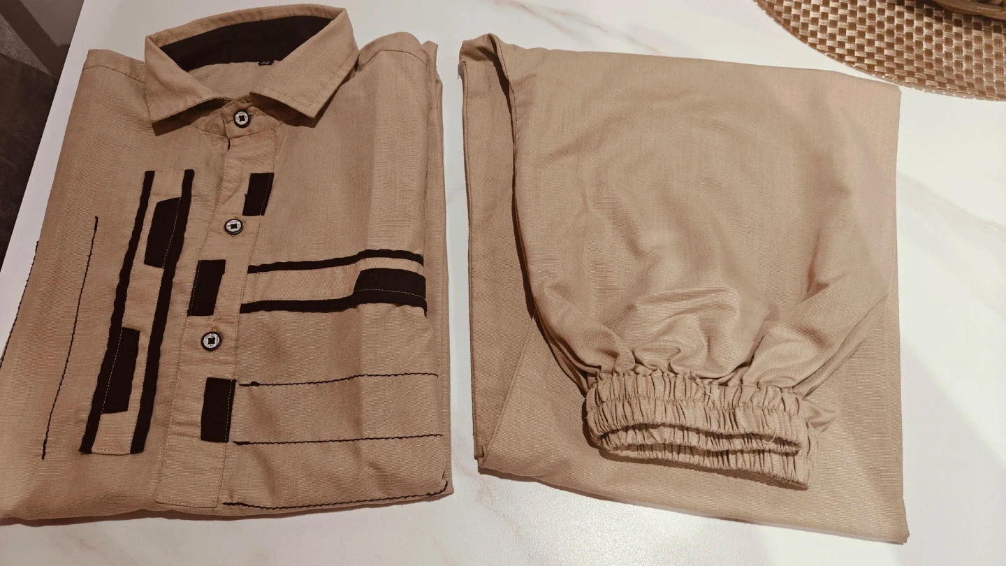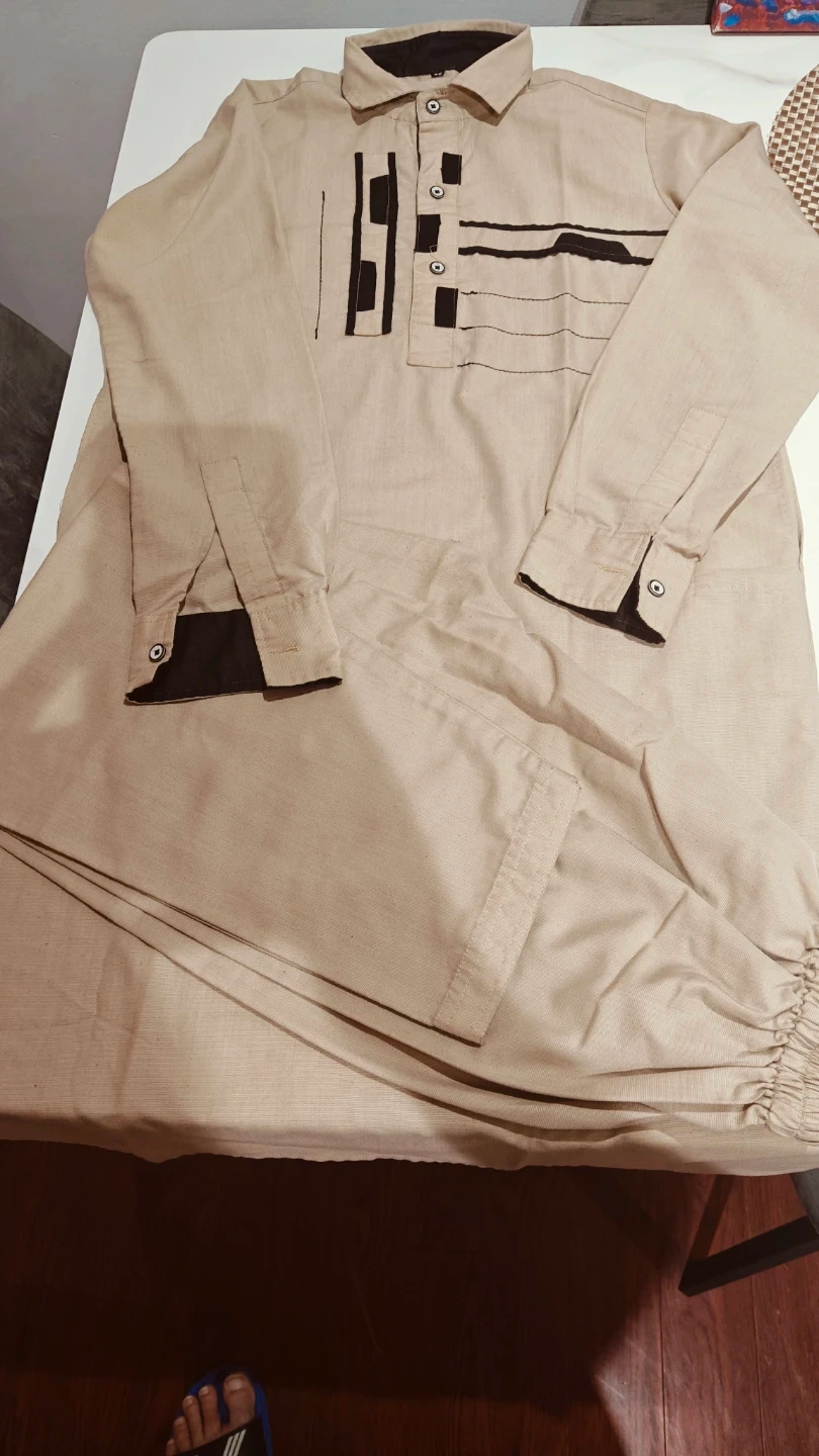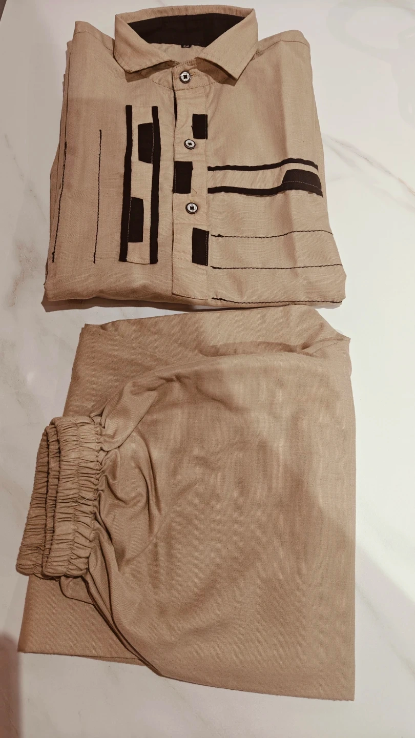 Comfortable two-piece ethnic wear set. It's a kurta with a collared neckline and button closure, paired with matching elastic-waist trousers. The fabric appears to be a breathable linen blend. This outfit is suitable for casual wear or cultural events.