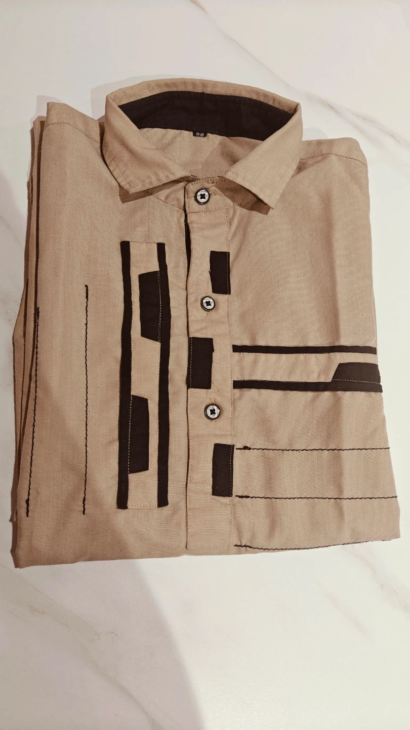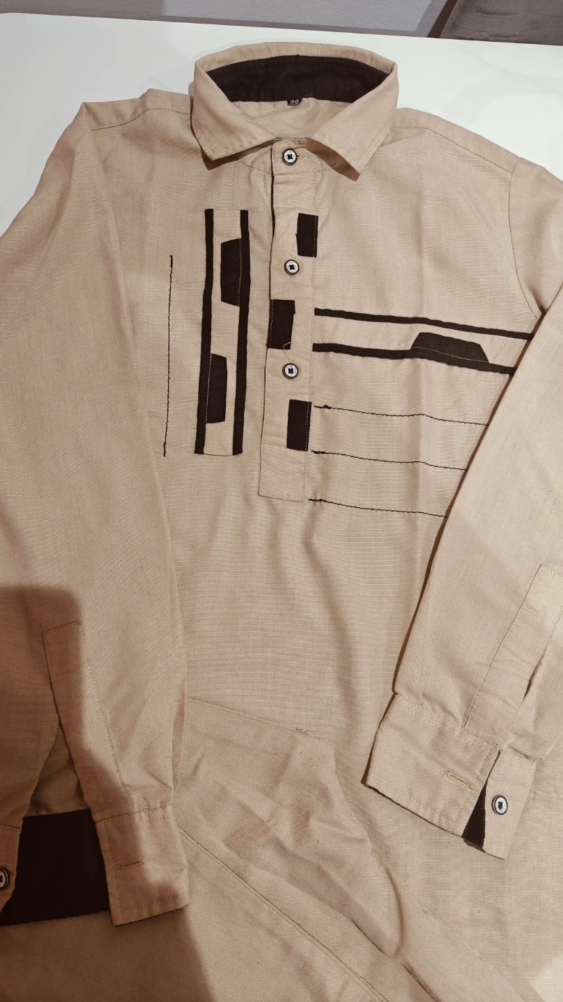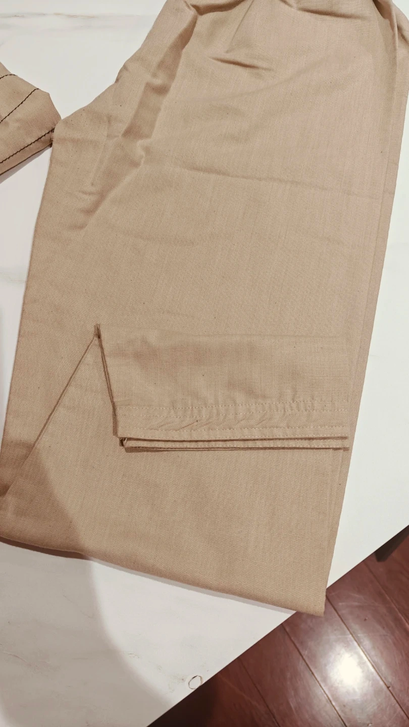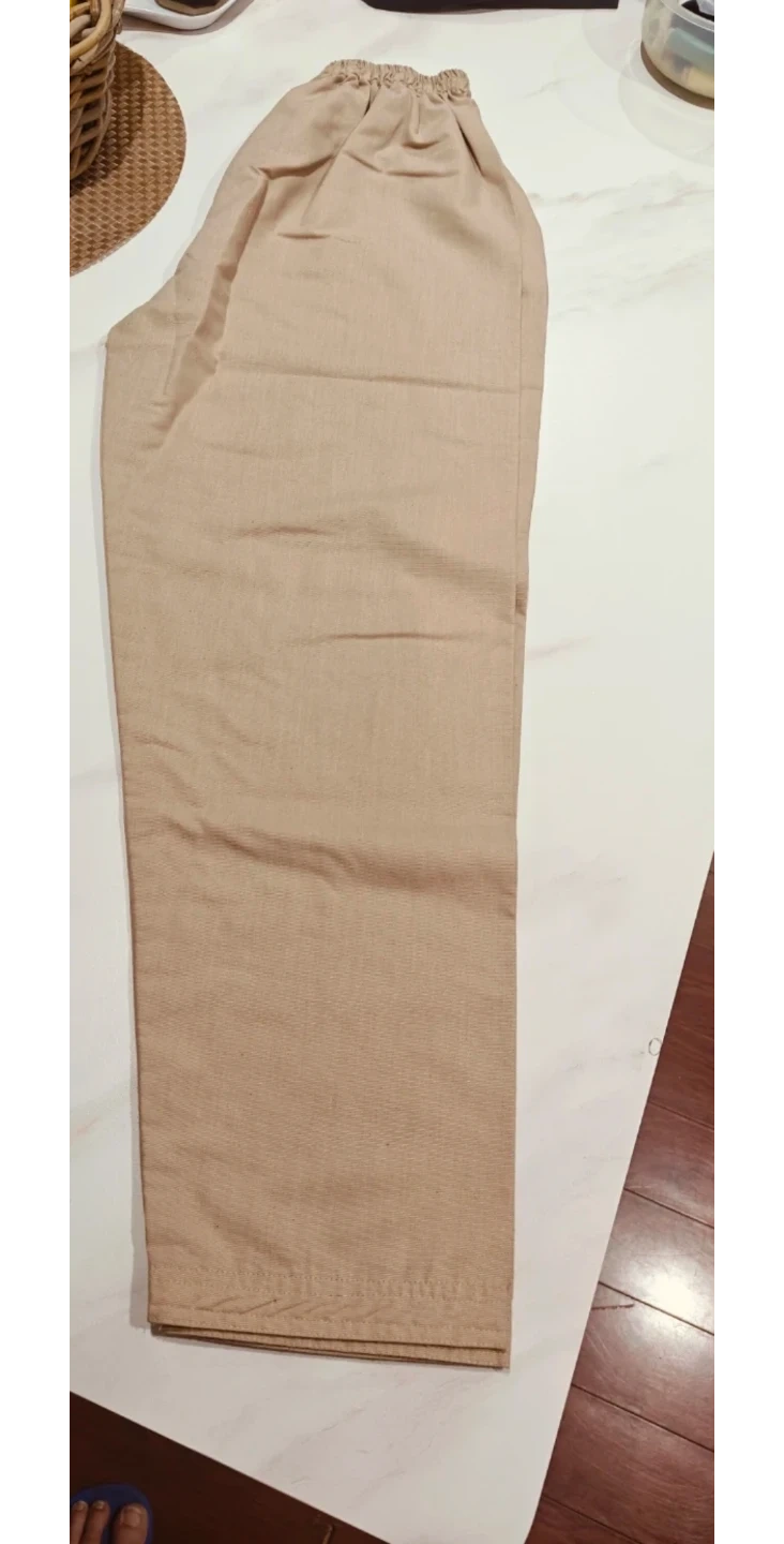 Comfortable two-piece ethnic wear set. It's a kurta with a collared neckline and button closure, paired with matching elastic-waist trousers. The fabric appears to be a breathable linen blend. This outfit is suitable for casual wear or cultural events.