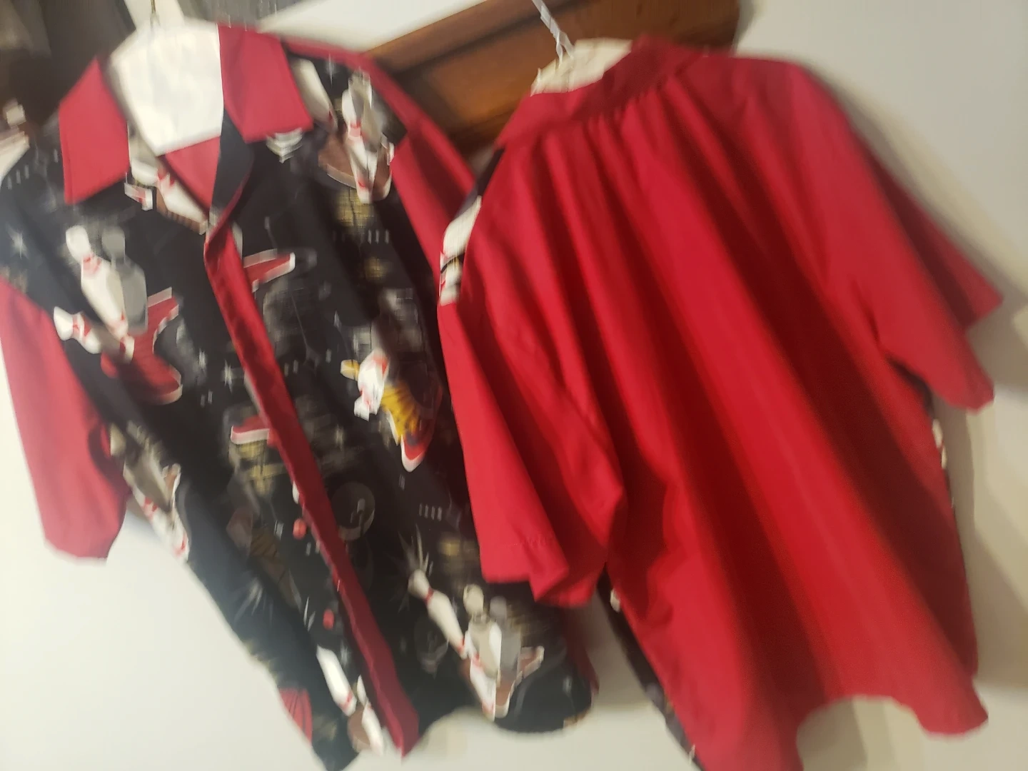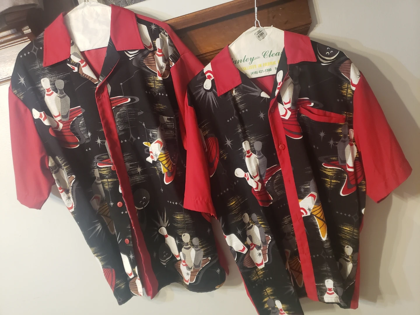 Two short-sleeve button-up shirts with a bowling pin and ball graphic. Both shirts have a black base with a bowling motif and bright red sleeves and collar accents. They're perfect for a retro look or a bowling league night!