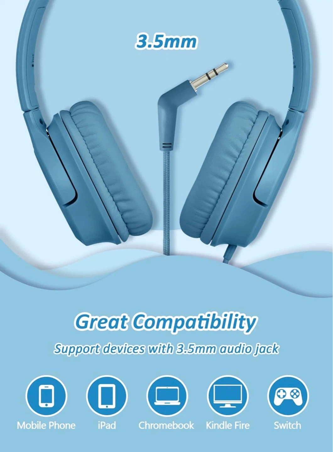 These DyBaxa kids headphones have HD stereo sound and a 94dB auto volume limiter to protect young ears. They feature soft, skin-friendly ear cushions and an adjustable headband for comfort. These headphones are foldable and portable, suitable for travel, school, or outdoor use. “Not box include”
