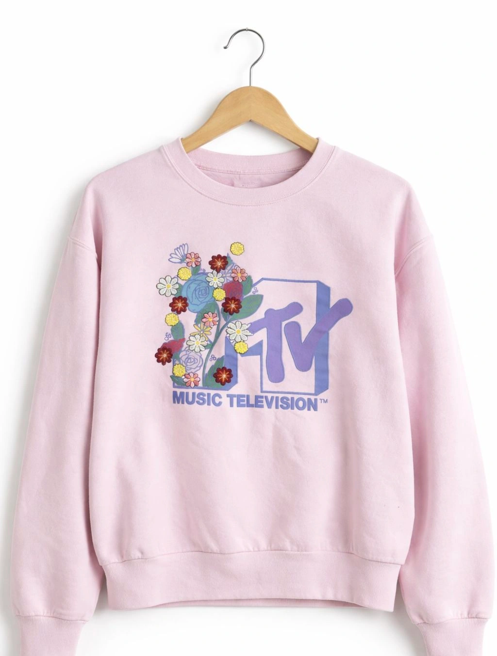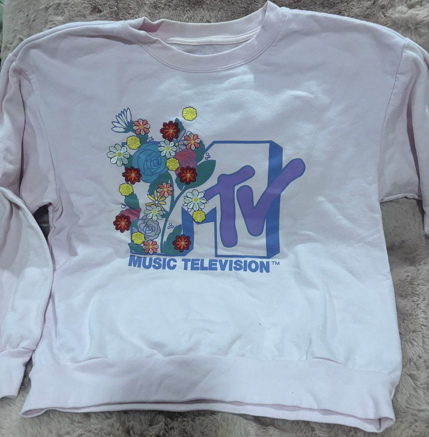 Excellent condition pre-owned MTV Music Television sweatshirt in a soft light pink color. Features a beautiful embroidered floral MTV logo on the front, giving it a fun retro-inspired look with a feminine touch. Cozy, comfortable, and easy to style for casual wear. This sweatshirt is in excellent condition! The embroidery is vibrant and intact, and the fabric remains soft. Brand: MTV (Music Television) Size: Women’s Medium - will also fit a small. Color: Light / pale pink. Crewneck sweatshirt with embroidered graphic (not printed). Long sleeves with ribbed cuffs and hem. Officially licensed merchandise. Material: 60% Cotton / 40% Polyester. Measurements (laid flat): Length: 21 inches (shoulder to hem), Pit to pit: 18 inches (across chest). Please compare measurements to a similar item you own to ensure best fit. Perfect for casual outfits, lounging, layering, or adding a retro pop to your wardrobe. A great everyday sweatshirt.
