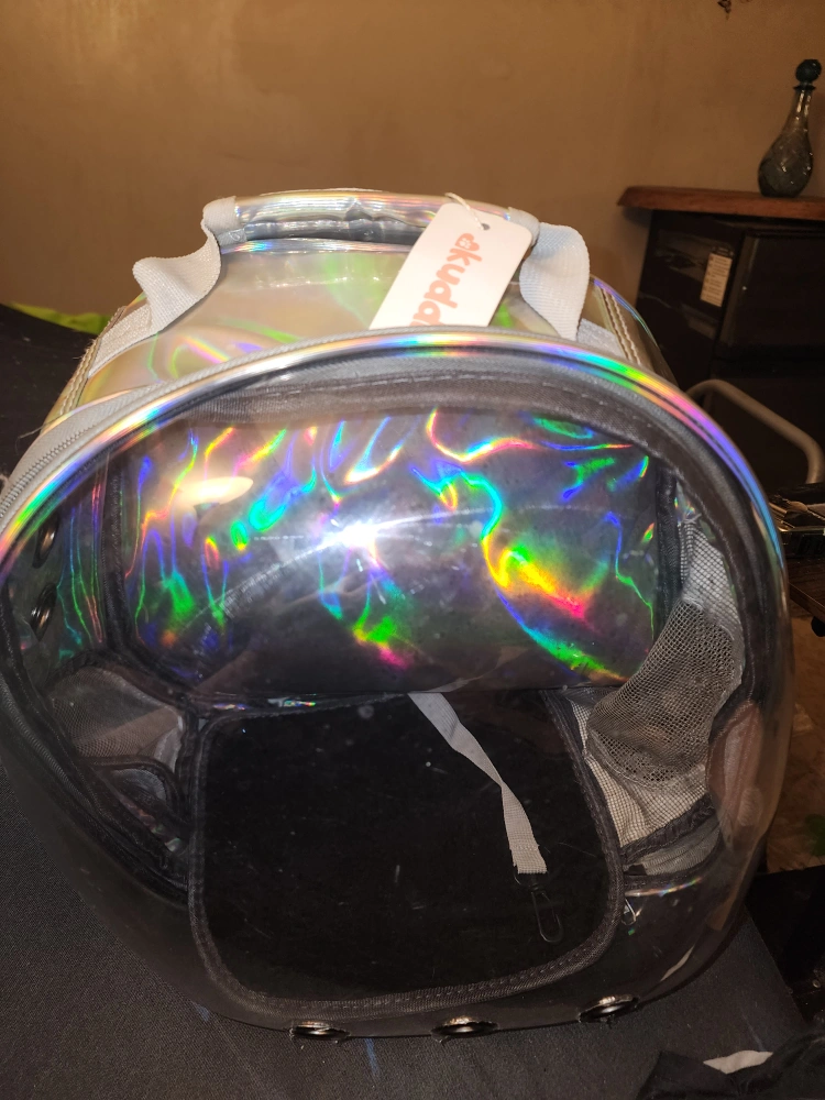 Check out this brand new Skydale pet carrier backpack! It's got a really cool holographic design that's sure to turn heads. Perfect for taking your furry friend on adventures in style. It features mesh pockets and adjustable straps for comfort and convenience