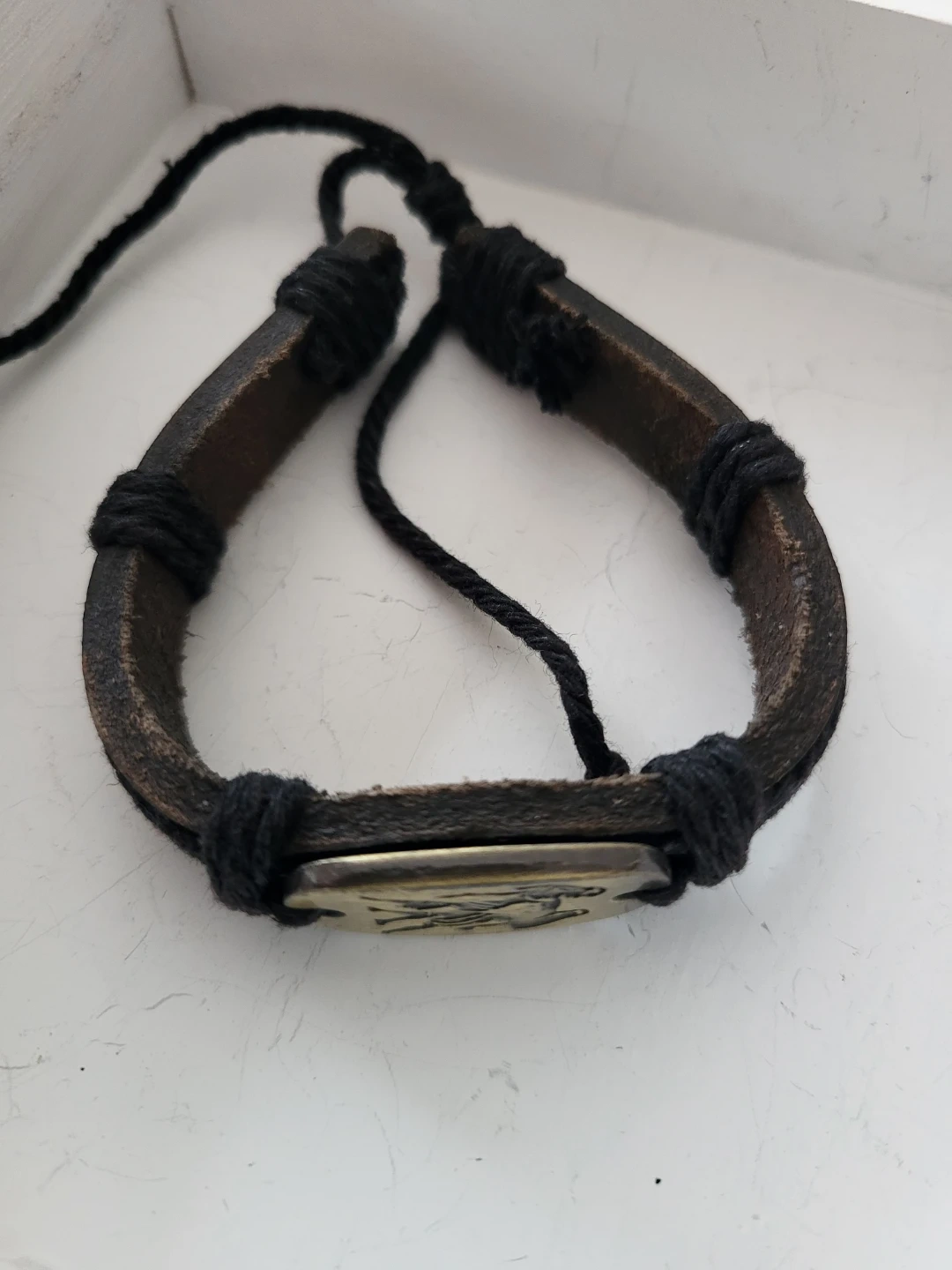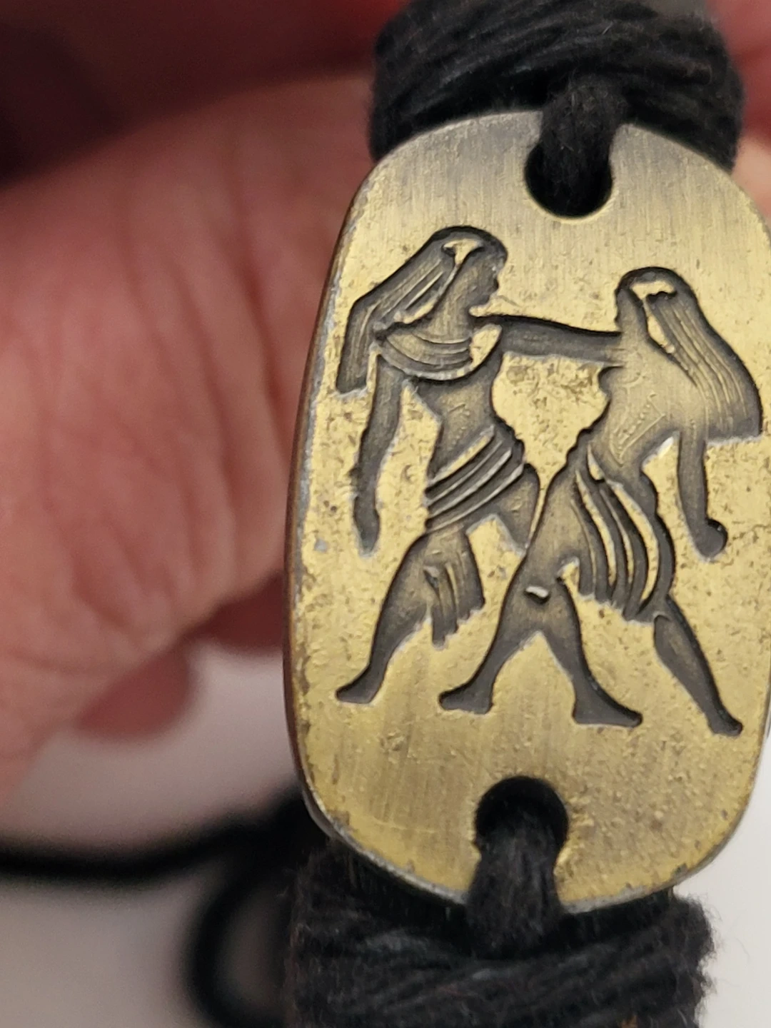 This bracelet features a brass-toned oval charm with the Gemini zodiac symbol etched into it. It's constructed with braided black leather and cord. The charm is mounted onto the leather band with black string. A great accessory for Gemini season!