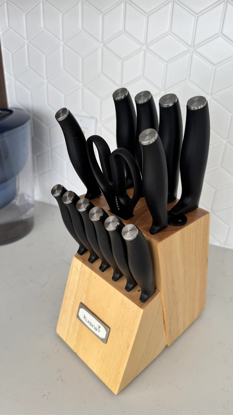 10Selling a Kuisine 13-piece knife block set. It comes with a variety of knives and a pair of scissors, all neatly organized in a wooden block. Perfect for any kitchen!
