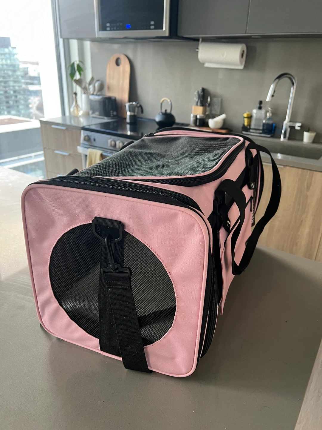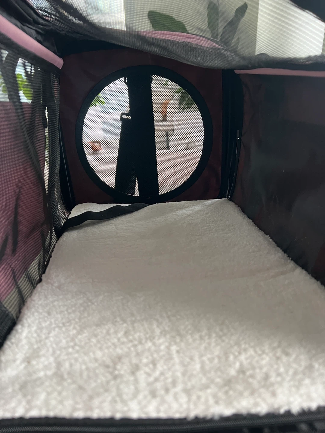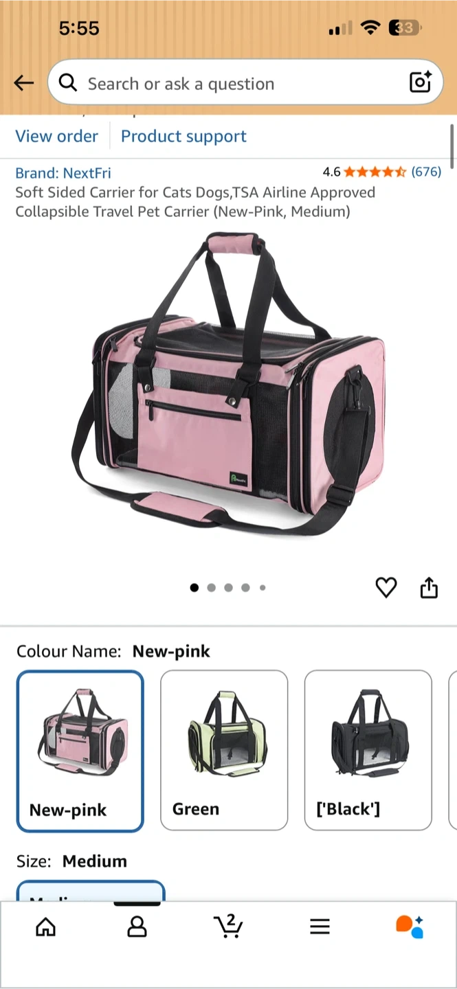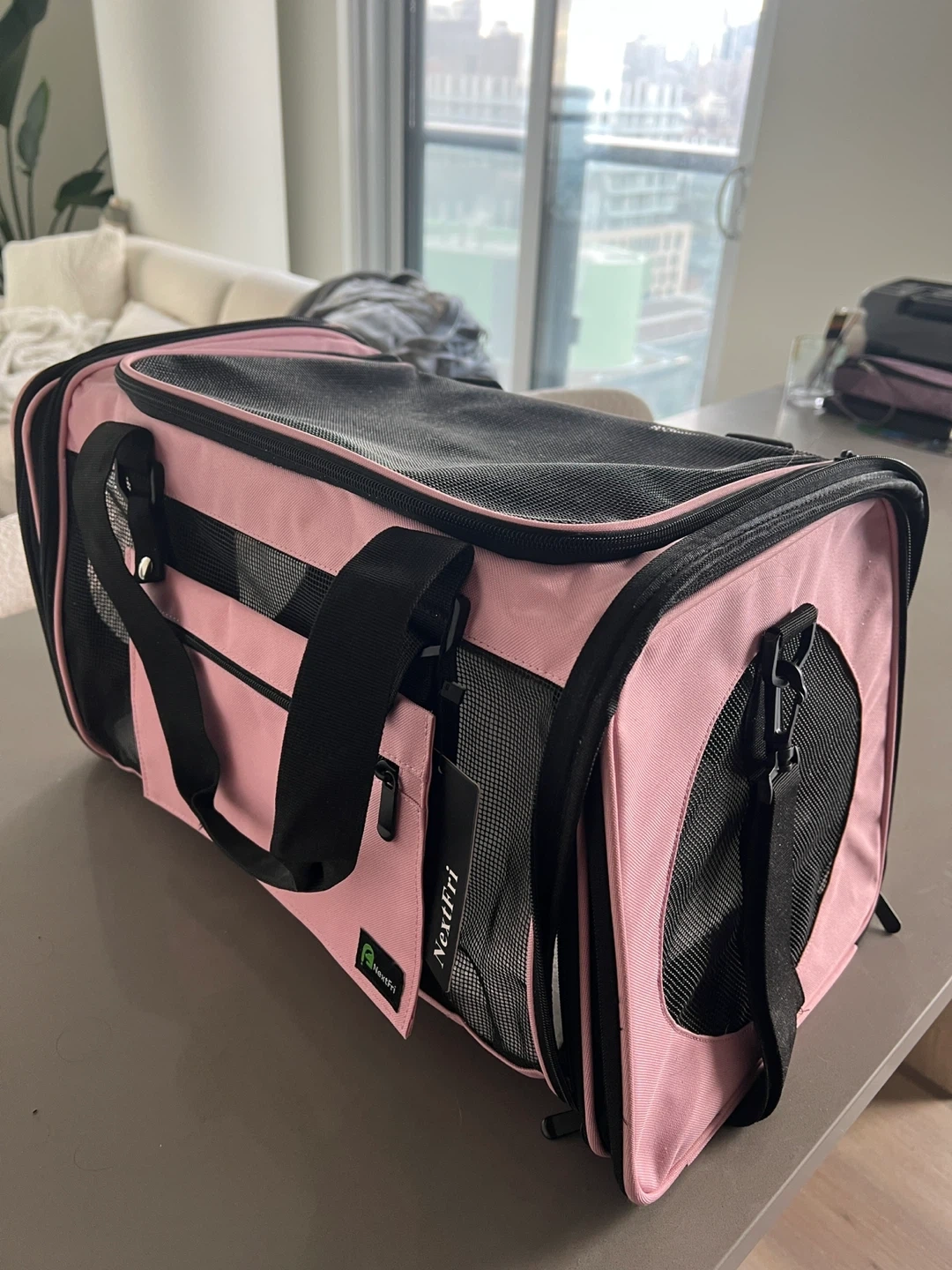 This is a pink, medium-sized pet carrier from NextFri. It's TSA airline approved and features mesh ventilation panels. Includes a soft interior mat. Only used once.