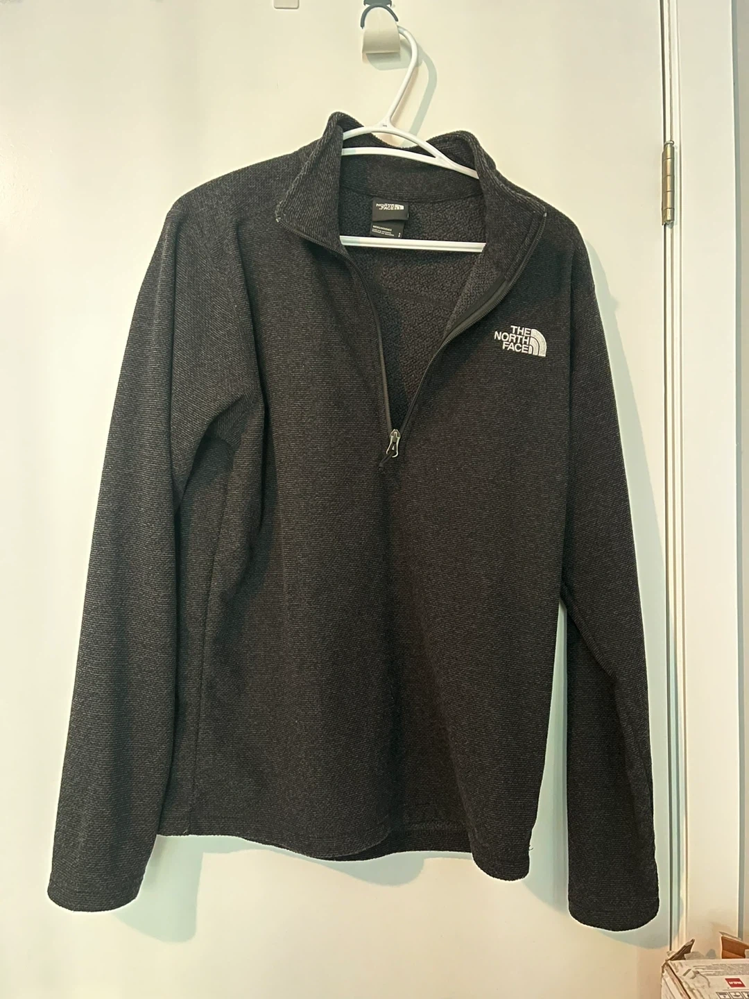 This is a men's The North Face Cap Rock textured zip-neck sweater. It's a dark charcoal colour. It's made of fleece material for warmth. This sweater is great for layering or wearing on its own during cooler weather.