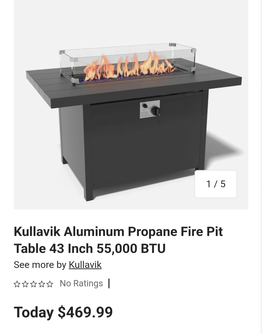 Selling a brand new Kullavik aluminum propane fire pit table. It's 43 inches and has a 55,000 BTU output. Originally priced at $469.99 Fully assembled! Comes with a new cover. 20 lbs tank not included.