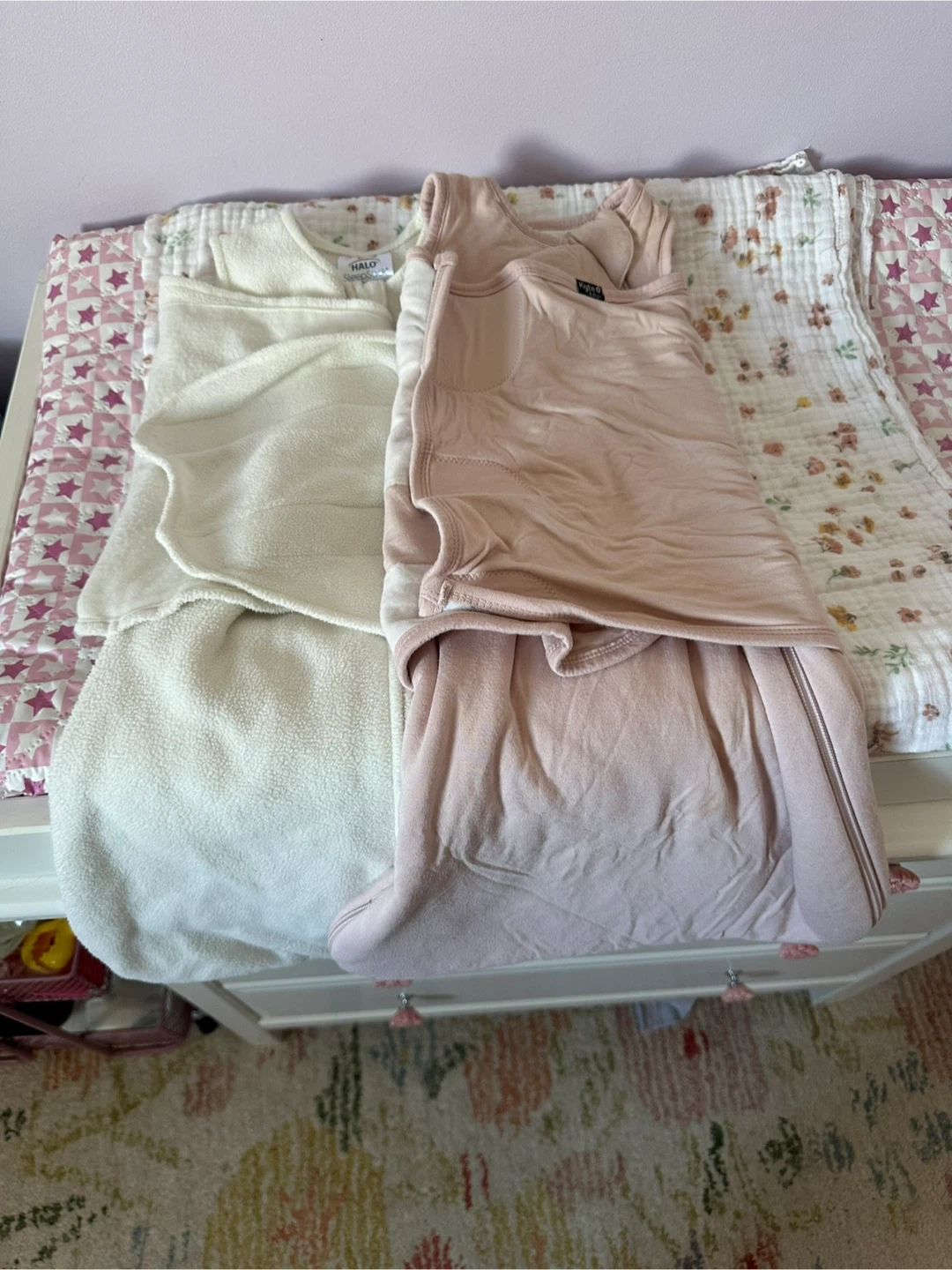 Two baby sleep sacks for a comfy and secure sleep. Includes a pink Kytd SleepSack Swaddle and a cream muslin swaddle blanket. Perfect for keeping your little one snug all night long!