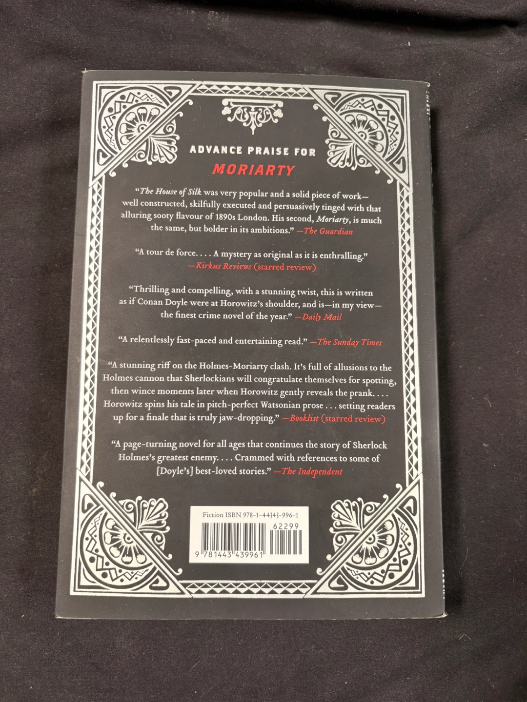 Selling a copy of Moriarty by Anthony Horowitz! It's a novel that continues the Sherlock Holmes series. A thrilling read!