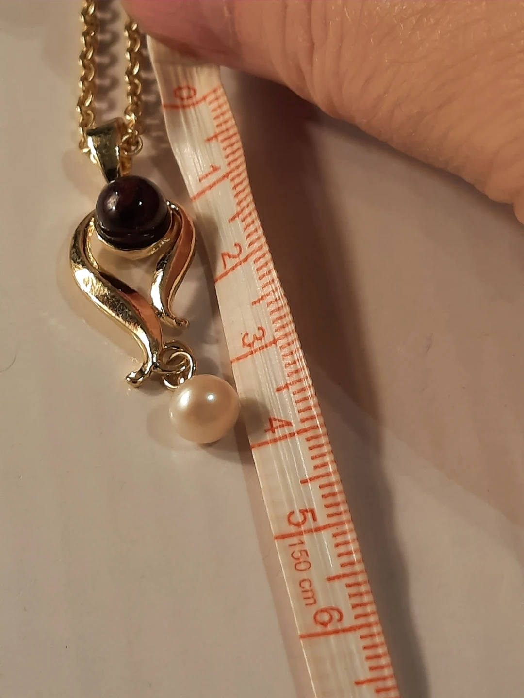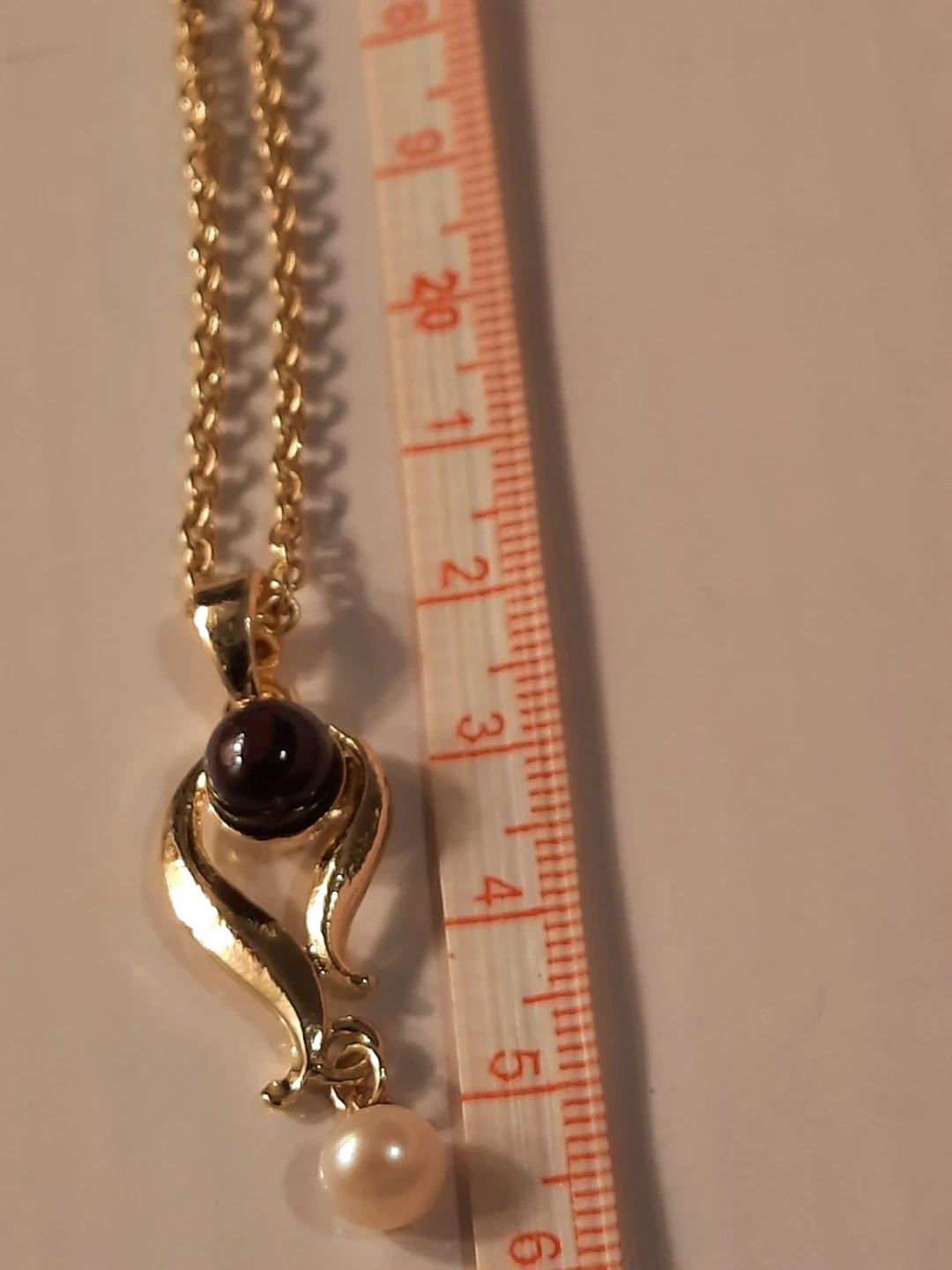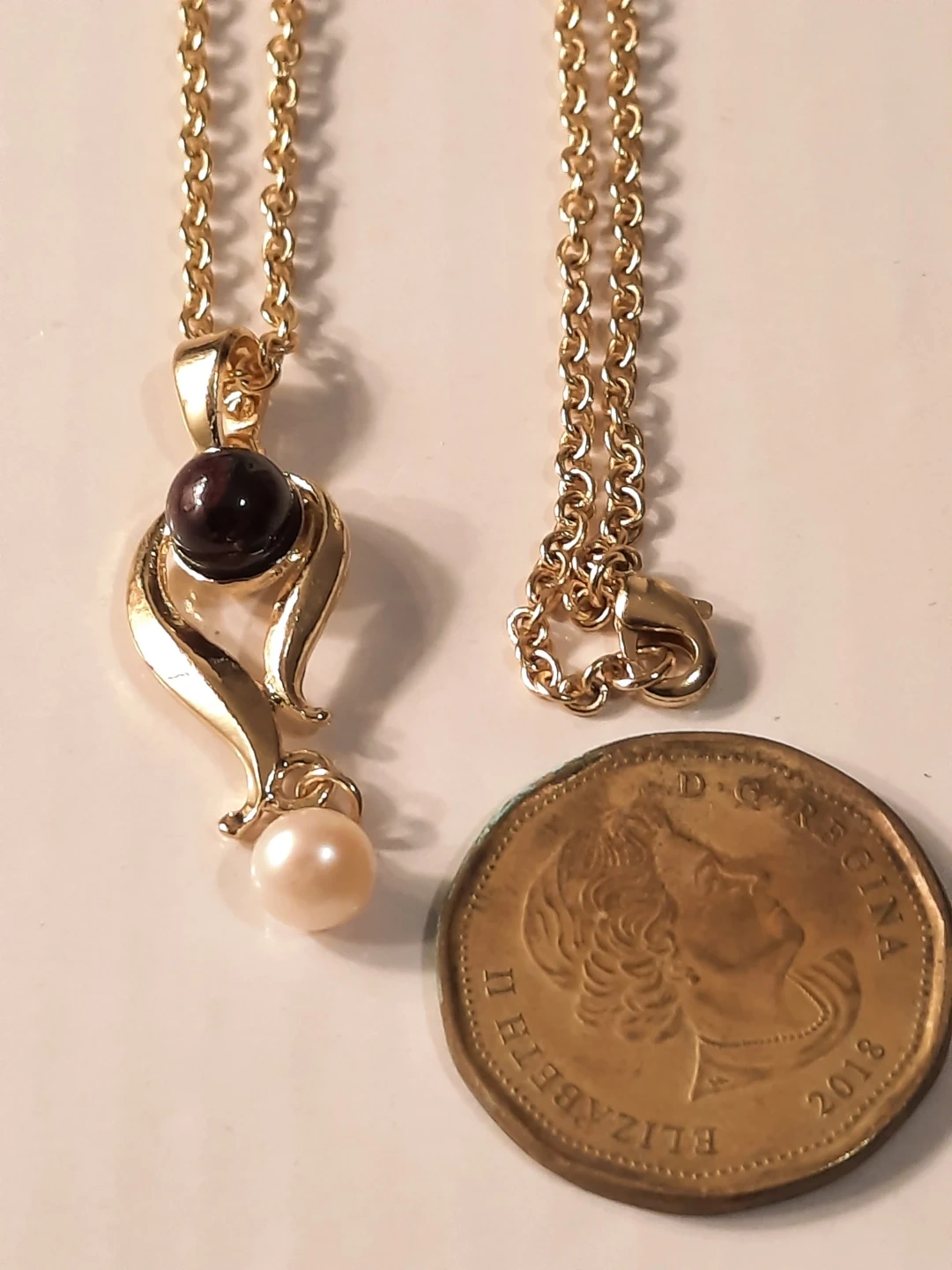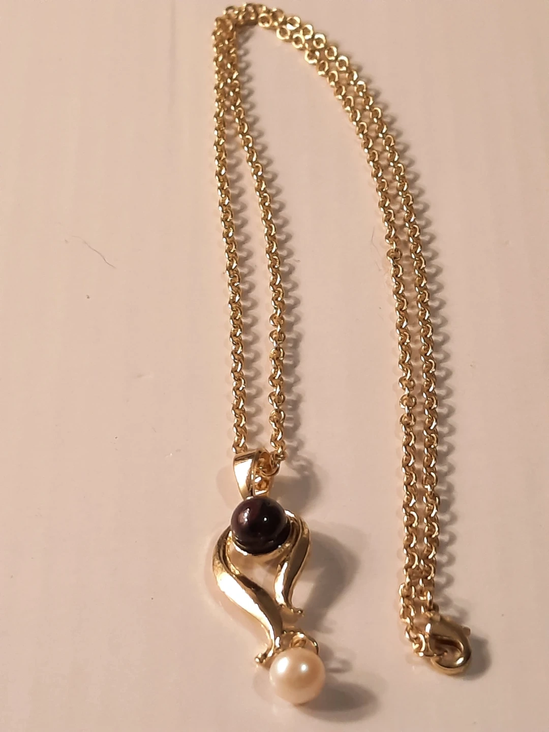 This 14K gold filled pendant necklace features a deep dark stone and a creamy real pearl. The chain is a classic link style. This piece would make a lovely addition to any jewellery collection.not solid.,new not used.