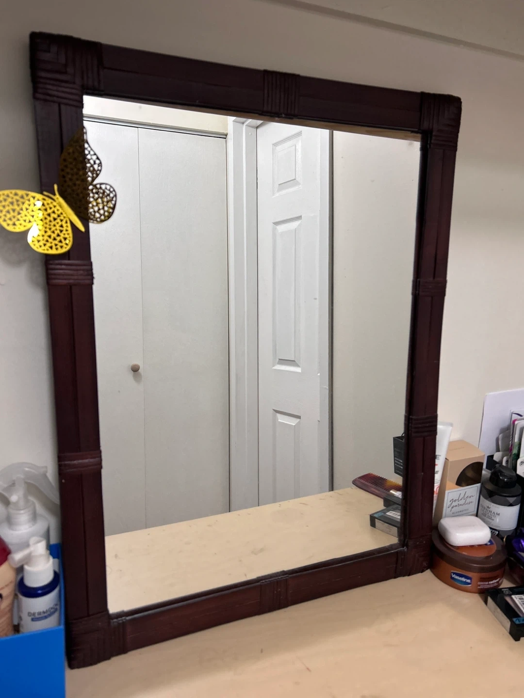 This mirror features a dark wooden frame with a woven texture detail. It's adorned with a charming yellow decorative butterfly on the side. You can remove it. Comes with box.