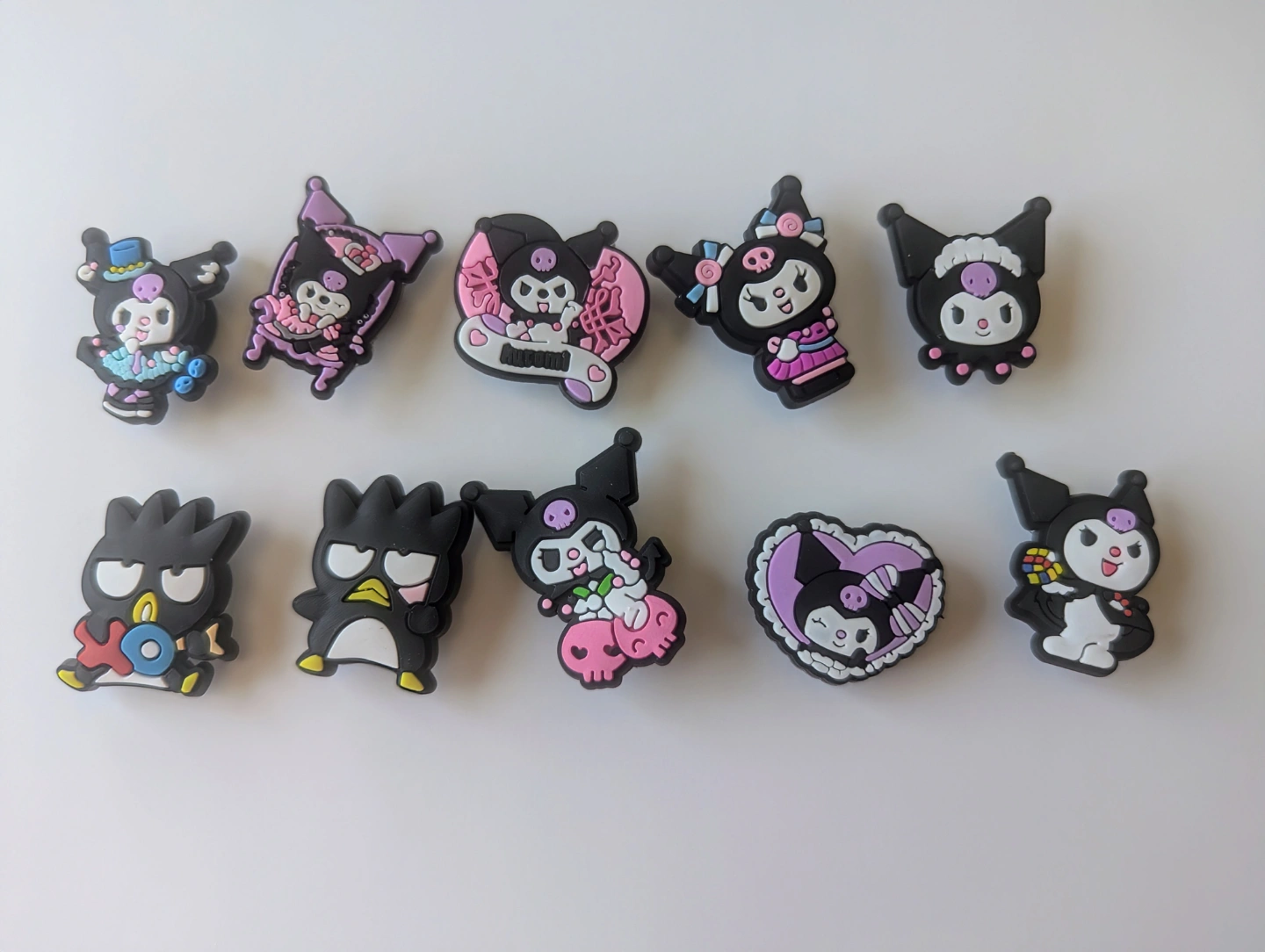28Ten adorable Kuromi and friends Jibbitz charms. Various designs featuring Kuromi, Keroppi and other characters. Great for shoes, bags, or crafts.