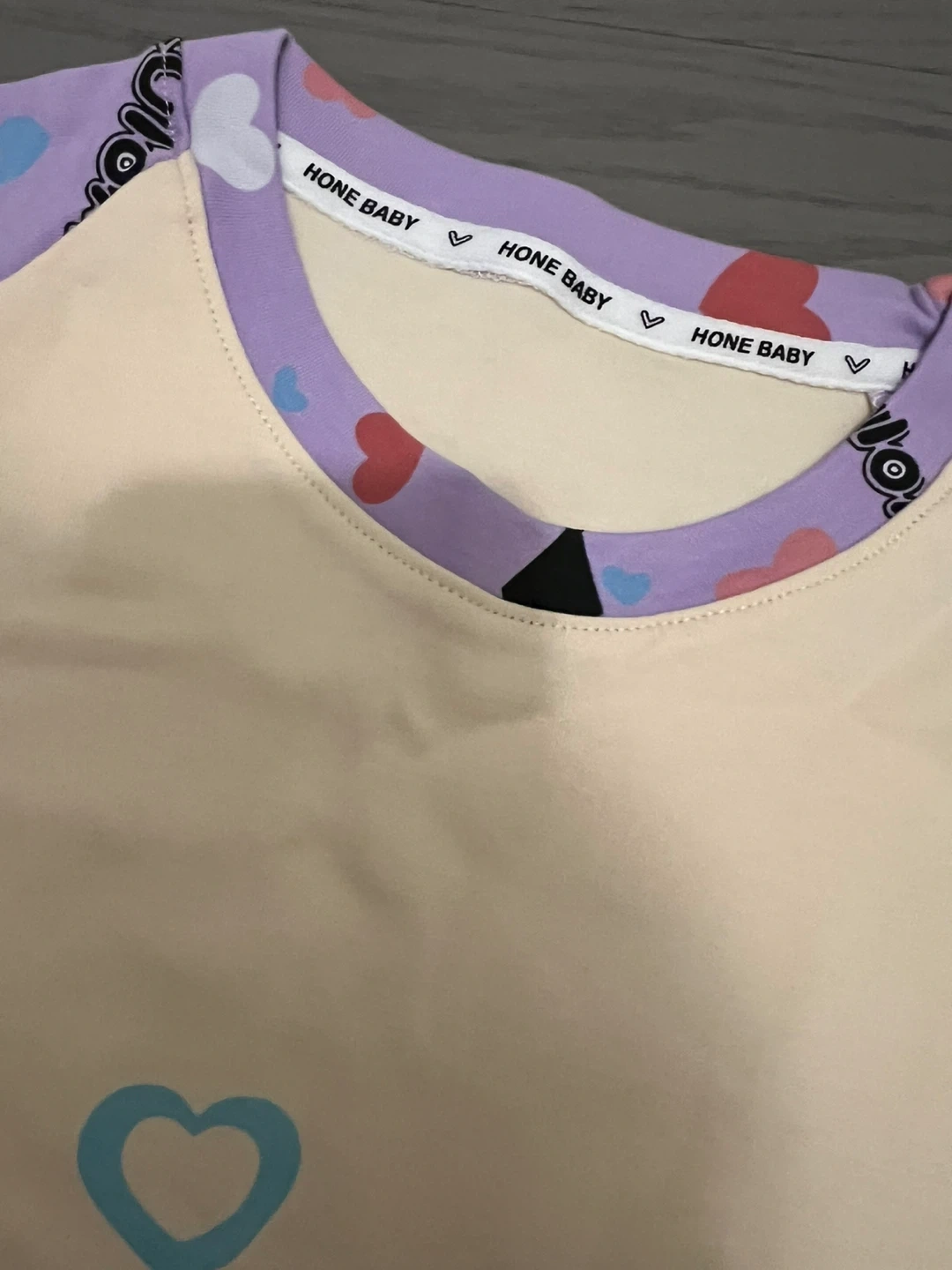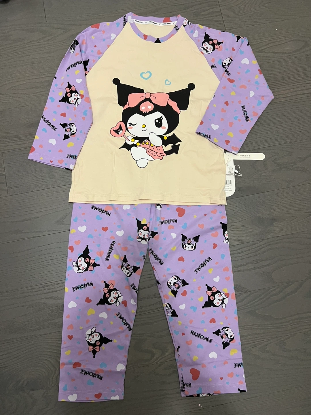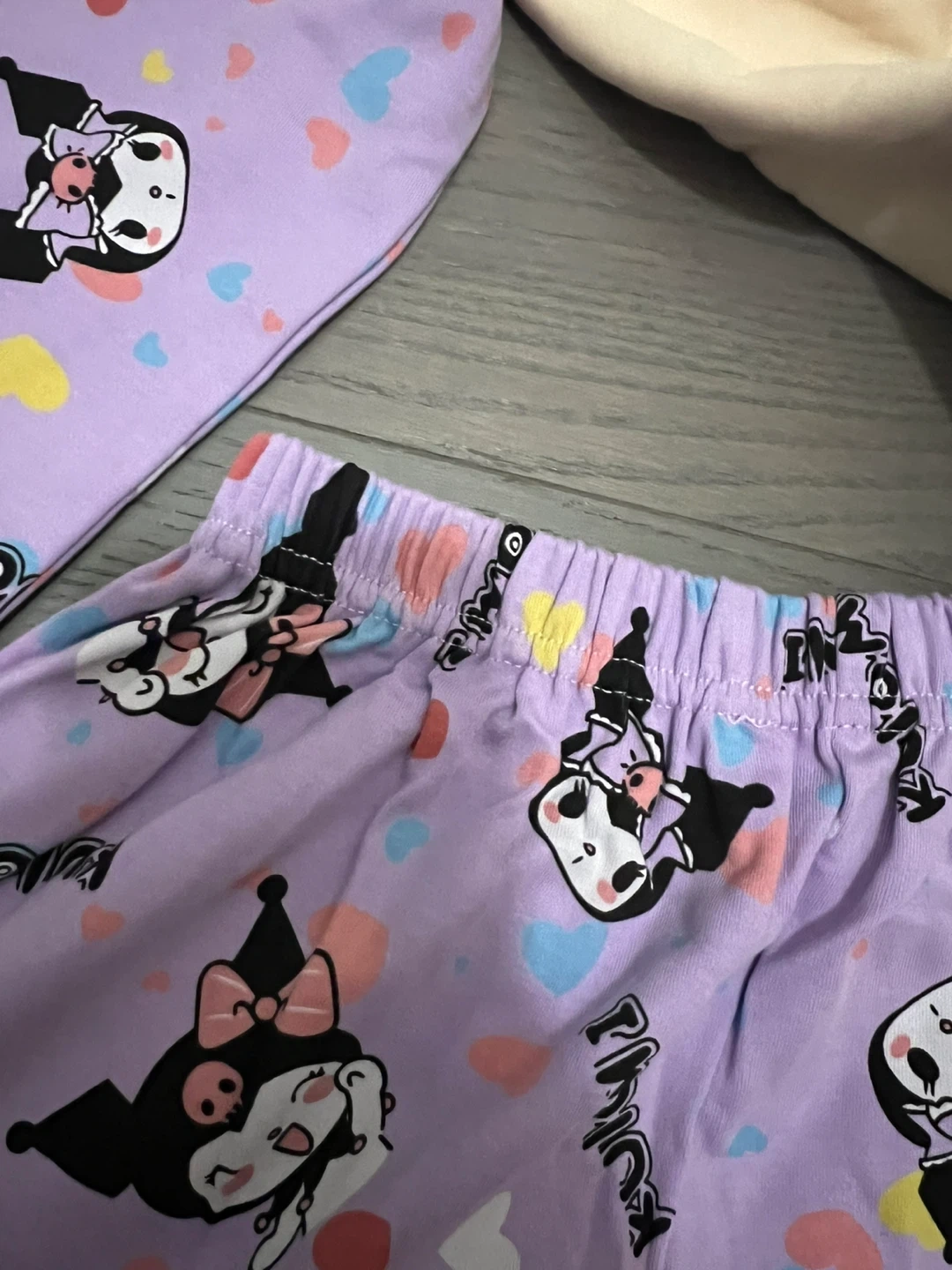 83Super cute Kuromi pajama set from Hone Baby! The top is a cream colour with a Kuromi graphic, and the pants are a matching lavender with Kuromi print. Perfect for lounging around the house!