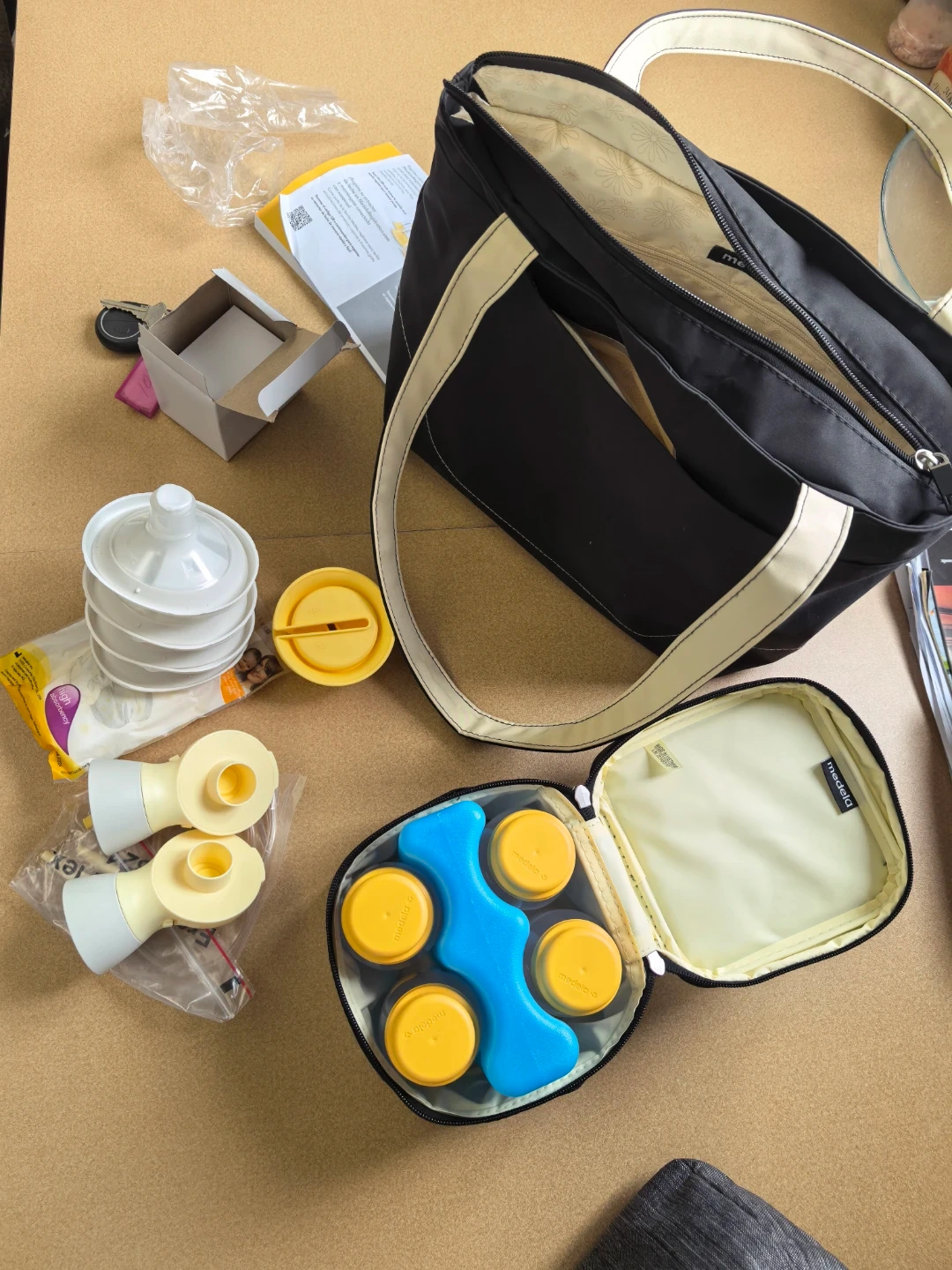 This is a Medela Freestyle Flex double electric breast pump. It comes with a black tote bag and a cooler bag with ice pack. It's designed for busy moms needing to pump on the go.
