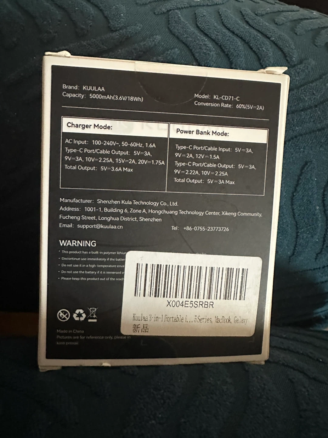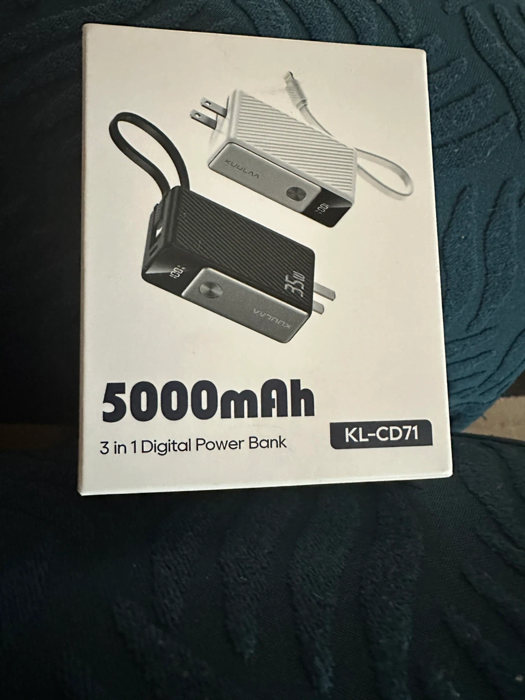 Selling a KUULAA 3-in-1 portable charger! It has a built-in lightning cable and a USB-C port for input/output. It's a 5000mAh digital power bank, model KL-CD71. It can recharge in 1 hour with USB-C or 2 hours with an AC wall plug