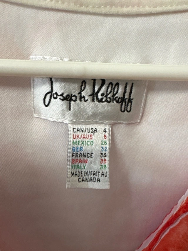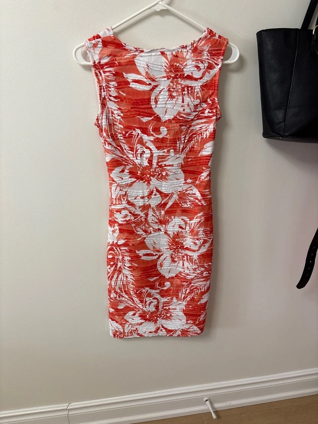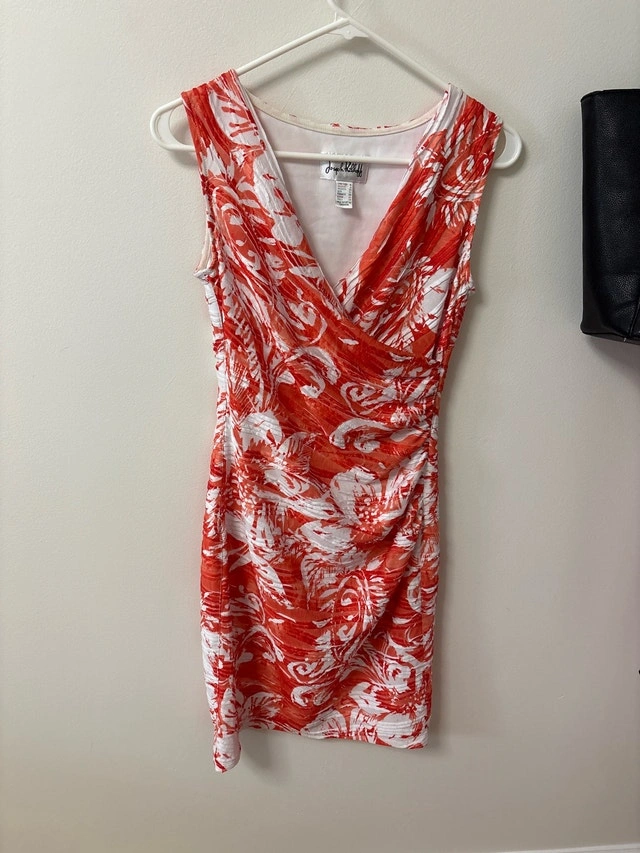 This is a gently used Joseph Ribkoff dress in size 4, featuring a vibrant orange and white floral pattern. It's perfect for adding a pop of colour to your wardrobe and has a lovely vintage charm. It fits like a small to medium, and would be beautiful for a wedding or an afternoon lunch. Key features: Brand: Joseph Ribkoff, Size: 4, Colour: Orange and white, Pattern: Floral. If the ad is still up, it's available!