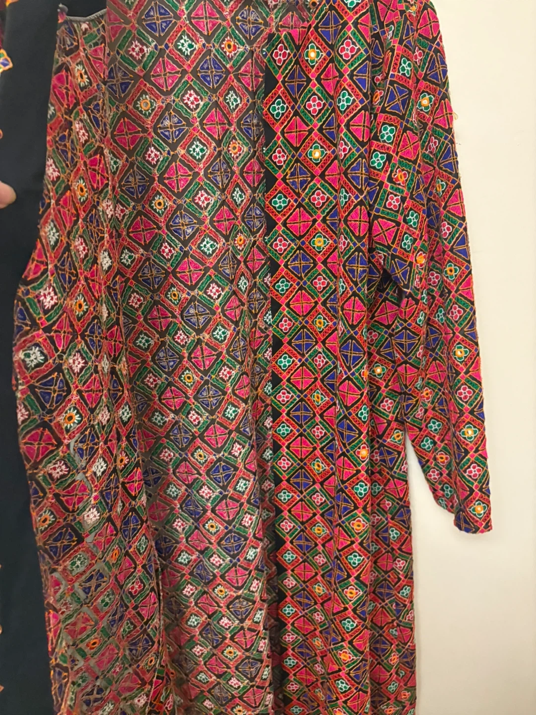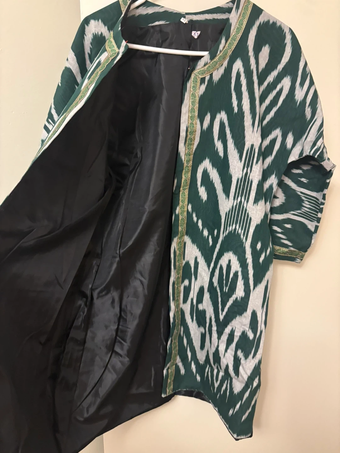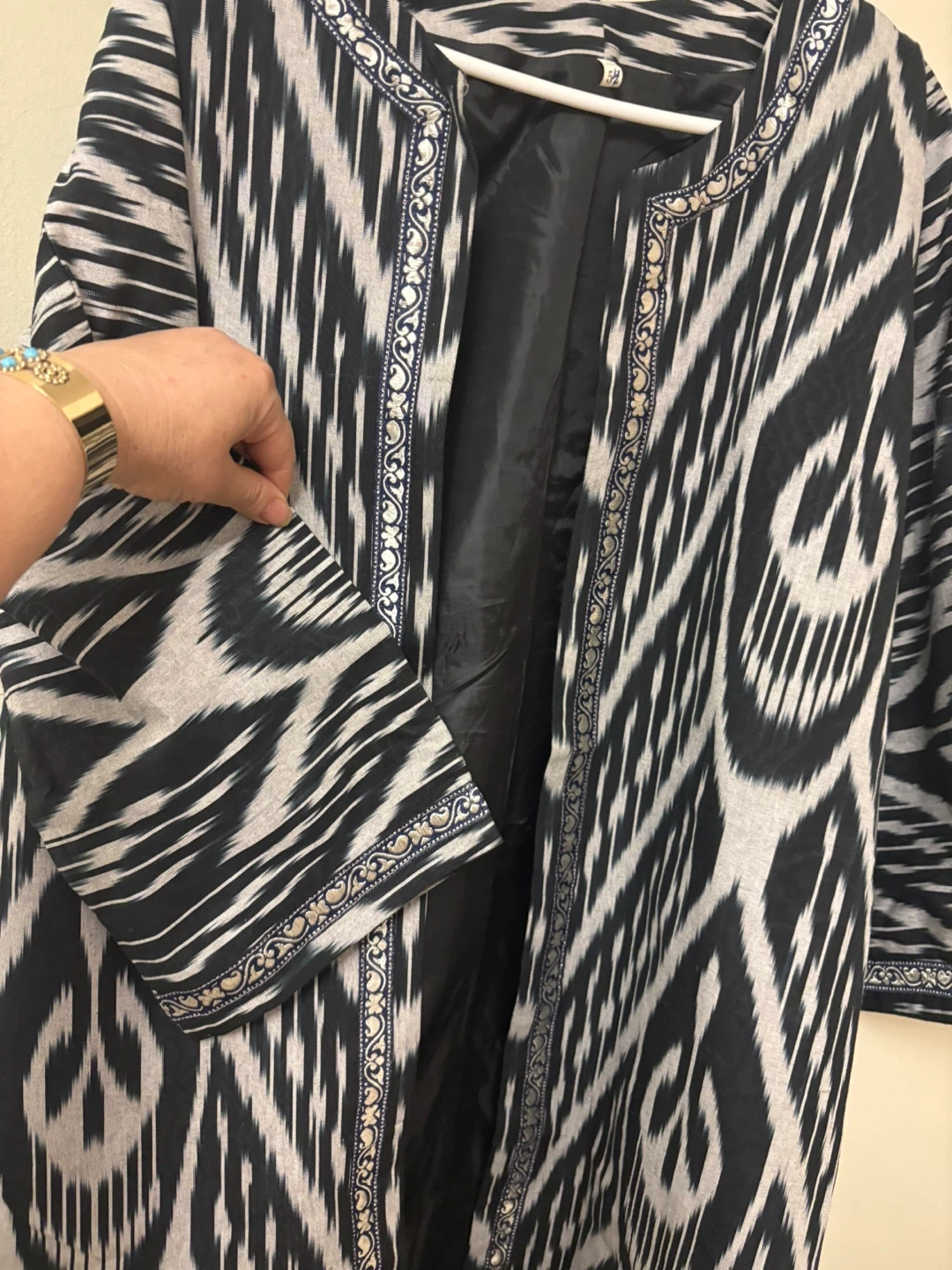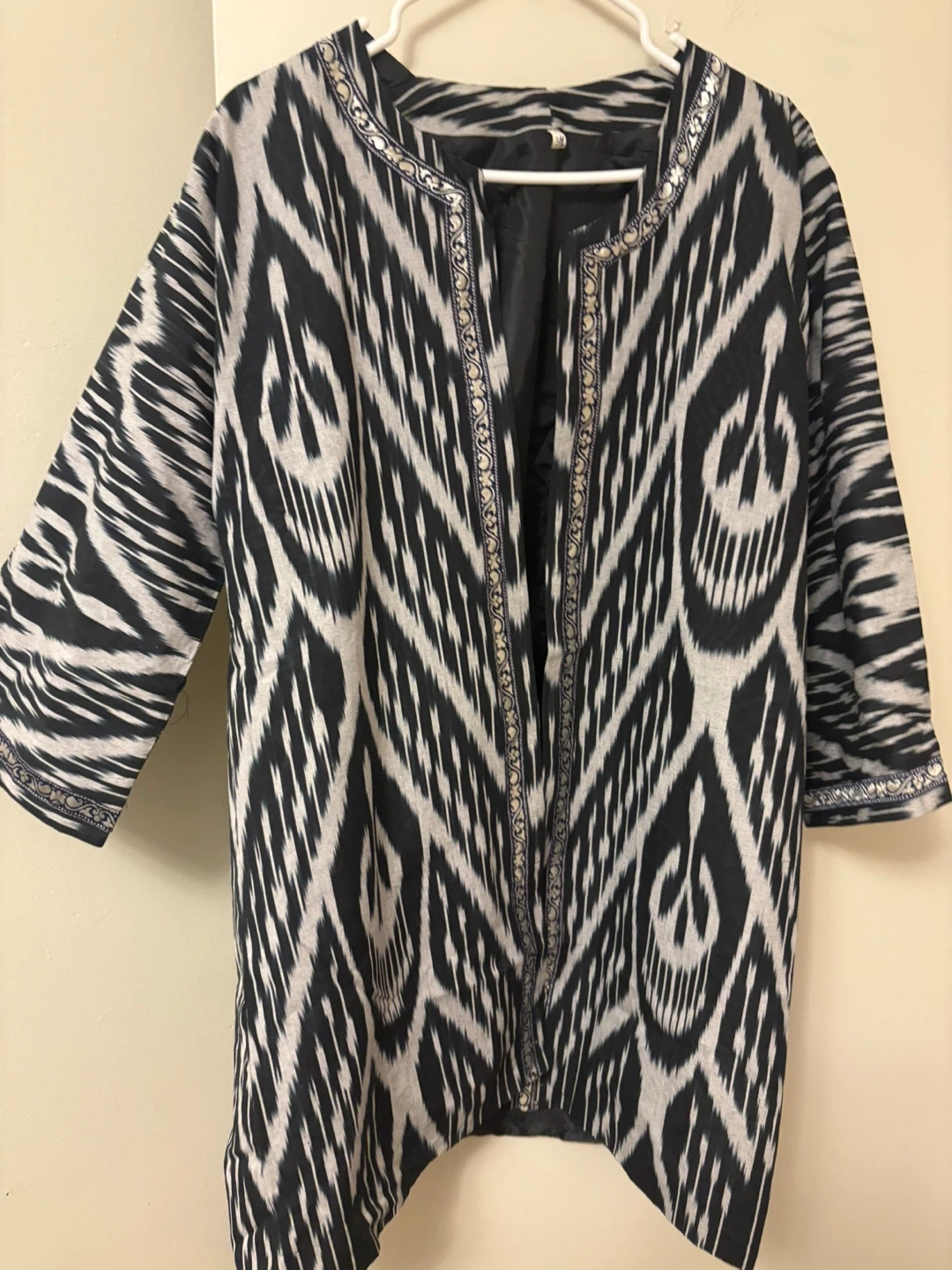 Gorgeous kimono-style jacket featuring a vibrant ikat print. Lined with black satin for a smooth feel. Sleeve length is three-quarter. This piece adds a unique flair to any outfit!