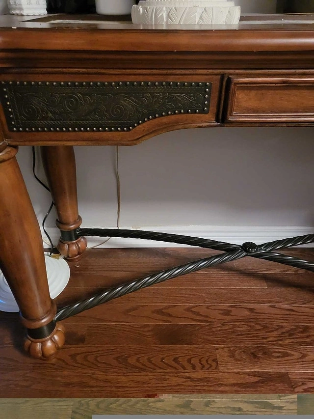 Sofa table or entrance table with hammered metal details. Dimensions: 53 inches wide x 19 inches deep x 33 inches high.