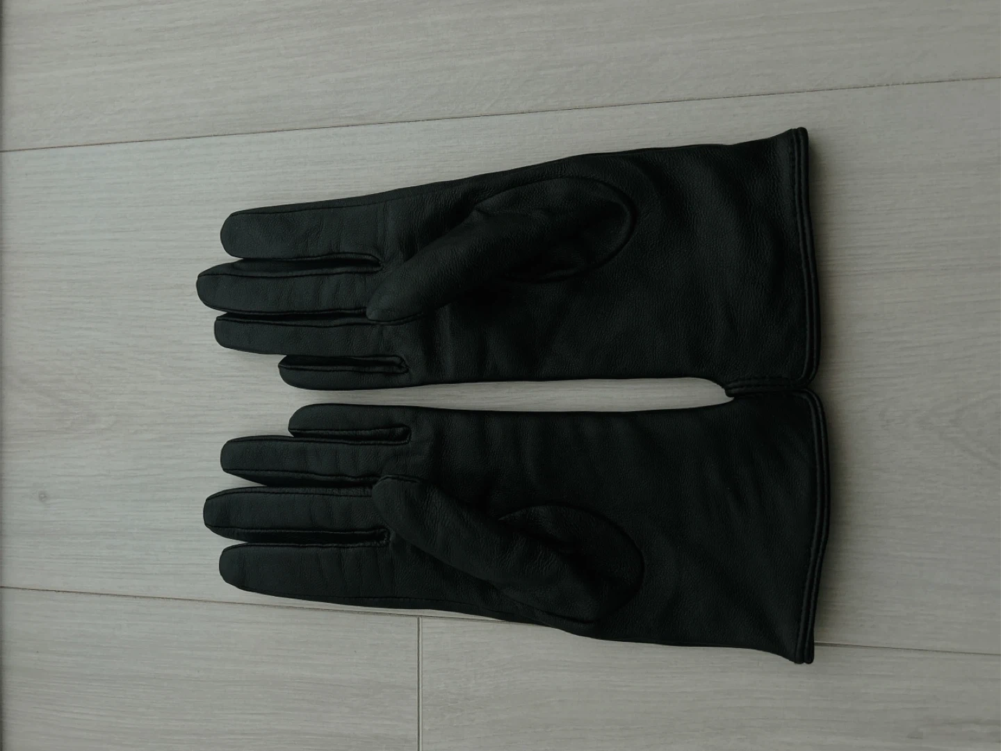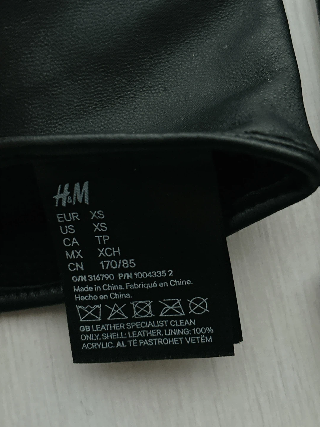 Black leather gloves from H&M. Shell is 100% REAL leather. Lining is 100% acrylic. These gloves are size XS. Professional leather clean only.