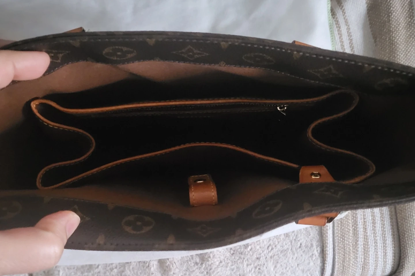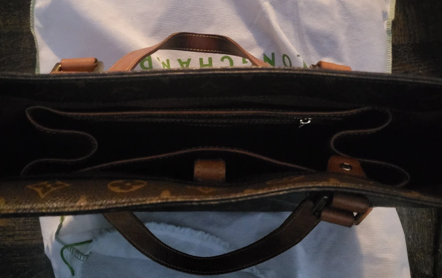 Classic Louis Vuitton tote bag in monogram canvas. It features leather handles and trim. Interior has multiple compartments, including a zippered pocket. This bag is perfect for everyday use or travel.