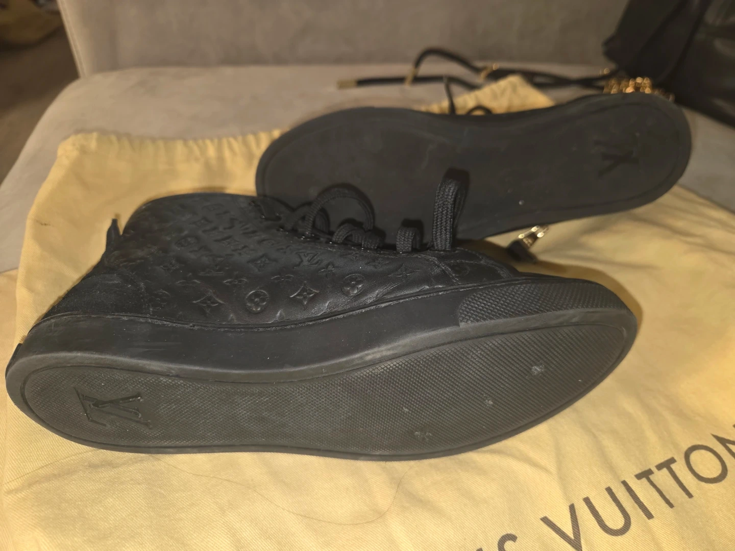 Selling a pair of Louis Vuitton high-top sneakers in black leather. These stylish sneakers feature the iconic LV monogram pattern throughout. They have a lace-up closure with a side zipper for easy wear. Great for adding a touch of luxury to your everyday look!