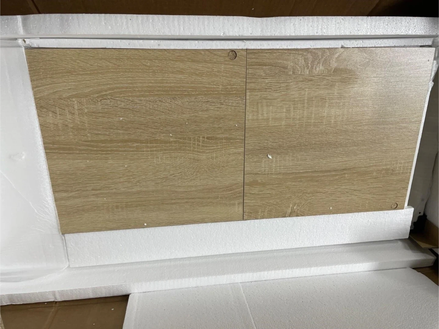 A modern white and wood grain TV stand with two cabinets and open shelving. It's 58 inches long and 19 inches high. Perfect for your entertainment setup!