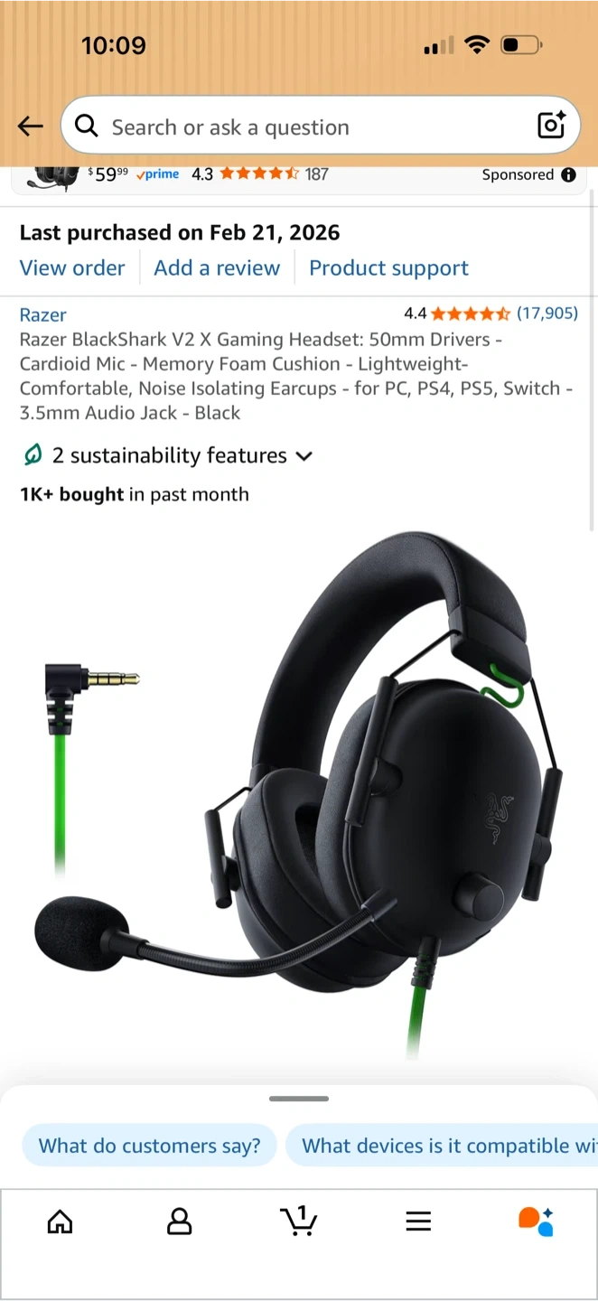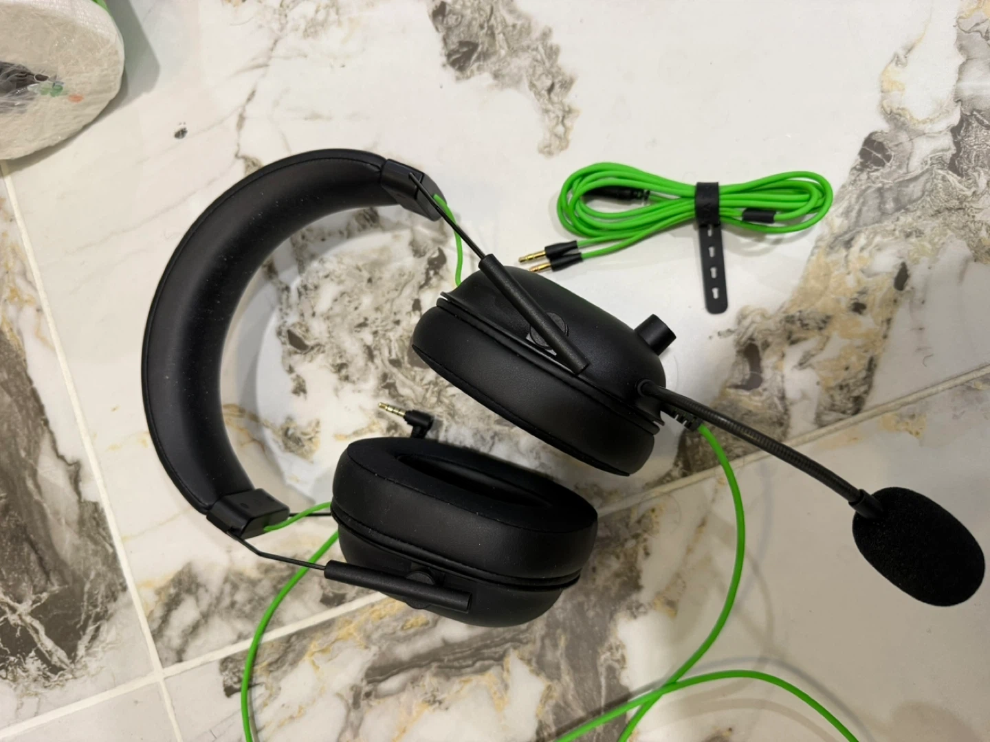 Razer BlackShark V2 X gaming headset β bought just 2 weeks ago, basically brand new. Only opened and tried once. Comes with the green braided cable and detachable mic. Sounds incredible β crystal clear audio and mic quality.
