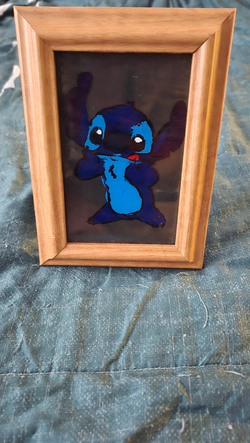 Hand-painted Stitch artwork in a wooden frame. This piece features the beloved character in vibrant blue and black colours. It's perfect for a Disney fan's collection!