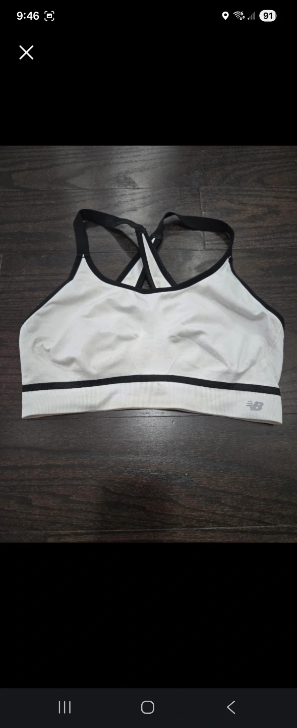 This is a white New Balance sports bra with black trim and straps. It features a racerback design. Made with comfortable, breathable fabric for active wear.
