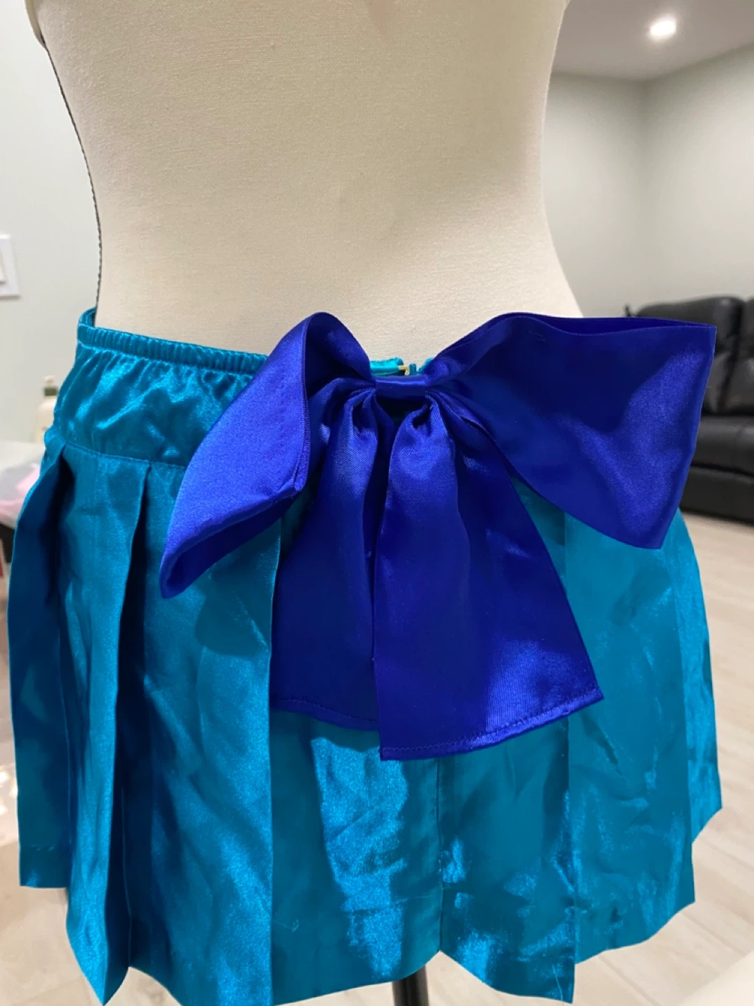 This vibrant blue sailor-style costume set includes a pleated skirt and a matching top with a large bow. It's a fun outfit for themed events. The fabric has a satin sheen.