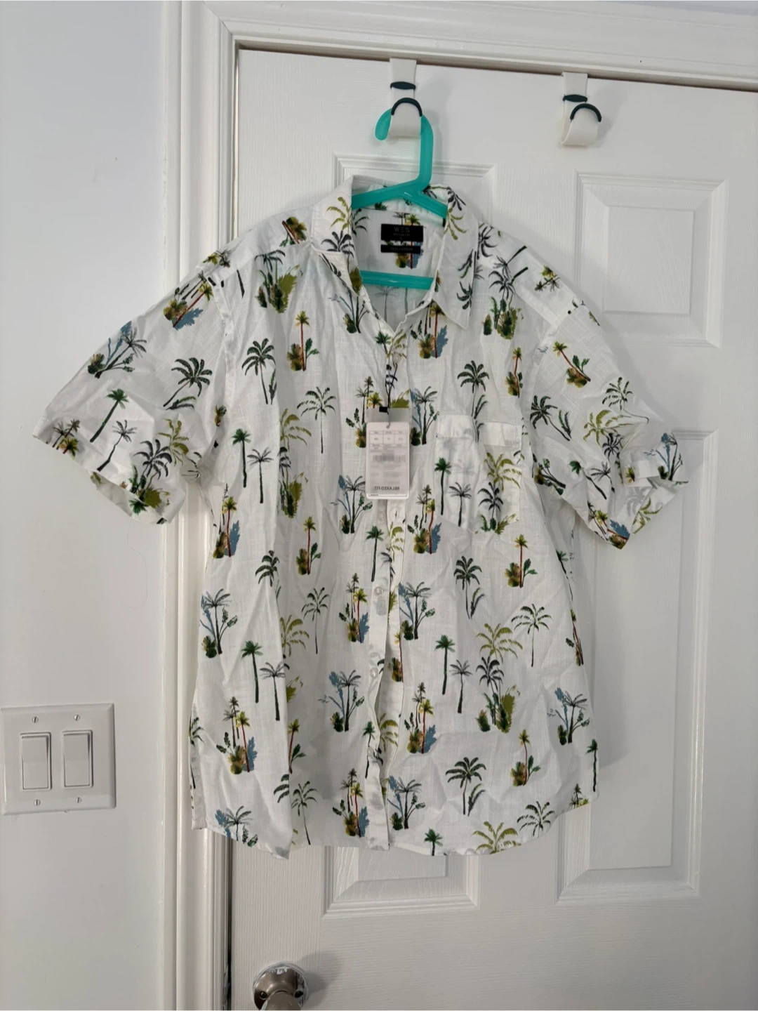 A classic short-sleeve button-up shirt featuring a vibrant white background with a tropical palm tree print. It's made from a lightweight fabric, perfect for warmer weather. This shirt has a button-down front and a chest pocket.