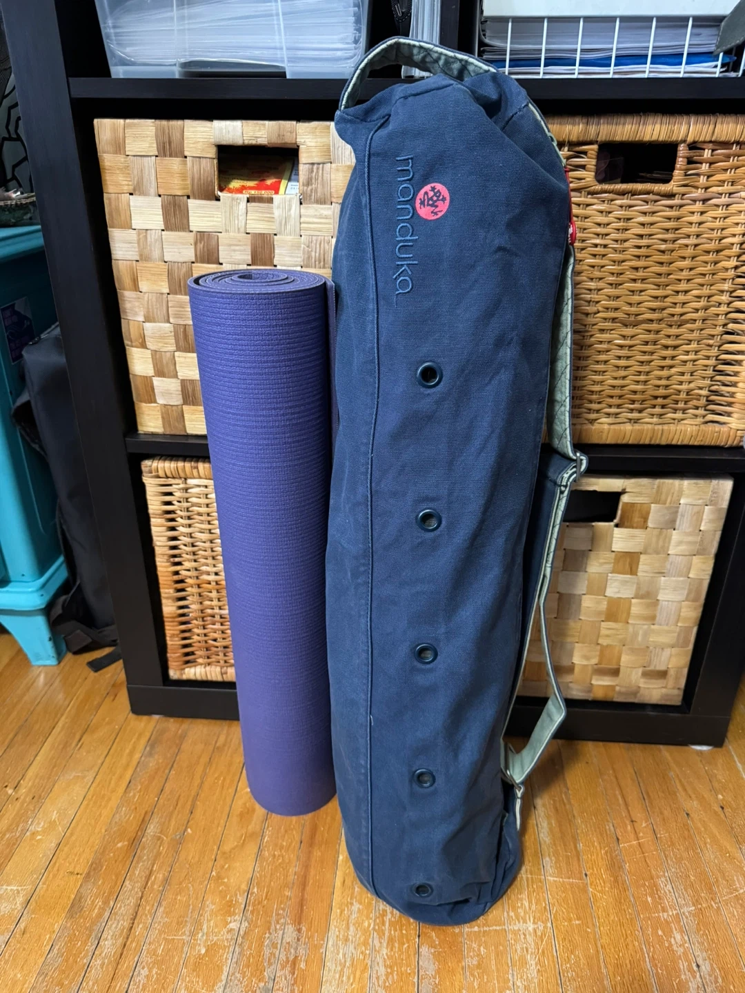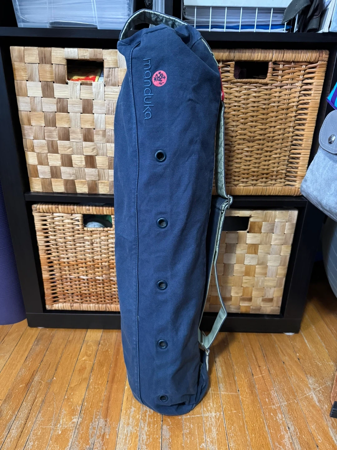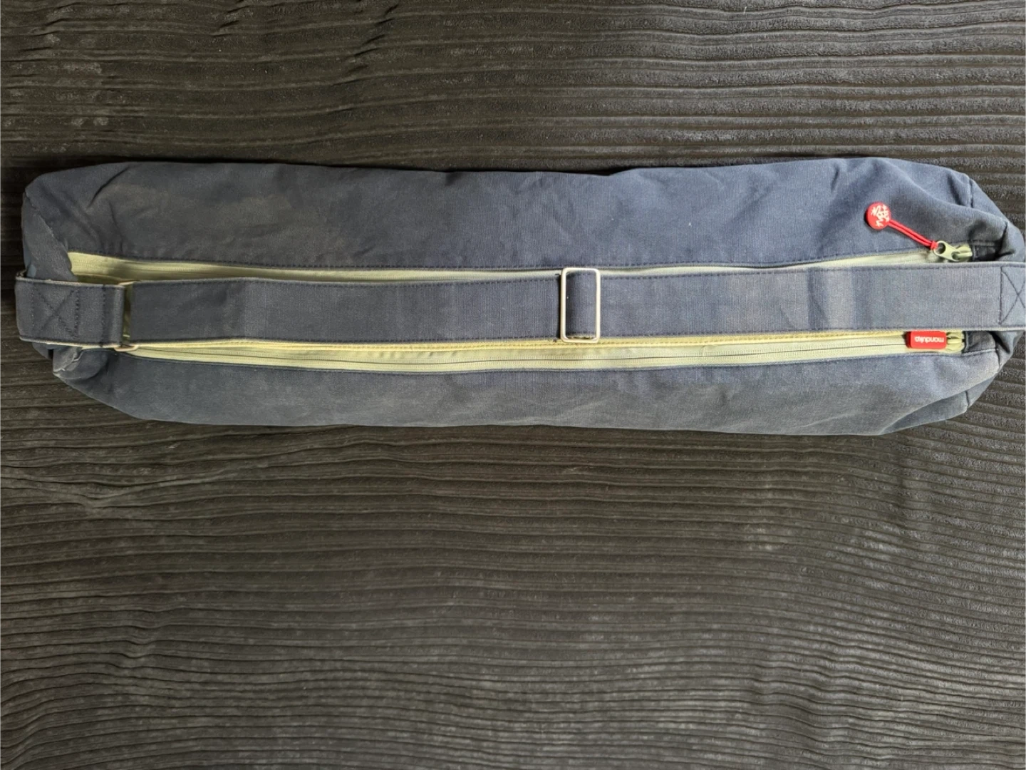 Manduka yoga mat bag in navy blue. Made of durable canvas material, with 2 zippered compartments and strong shoulder strap. Holds a pro Manduka, mat towel, clothing, and water bottle. Zippered pocket for credit cards/cash. And a key hook. It’s in great condition and has been washed.