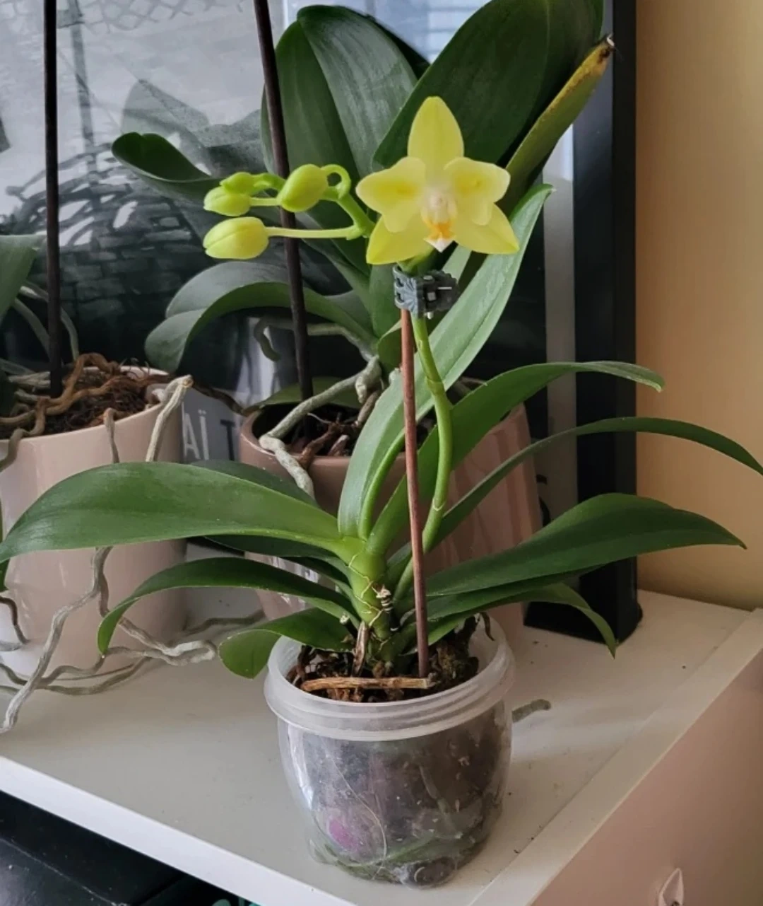 Selling a lovely yellow Phalaenopsis orchid! It's just starting to bloom and has some buds ready to open. It comes in a clear plastic pot, perfect for any indoor space.